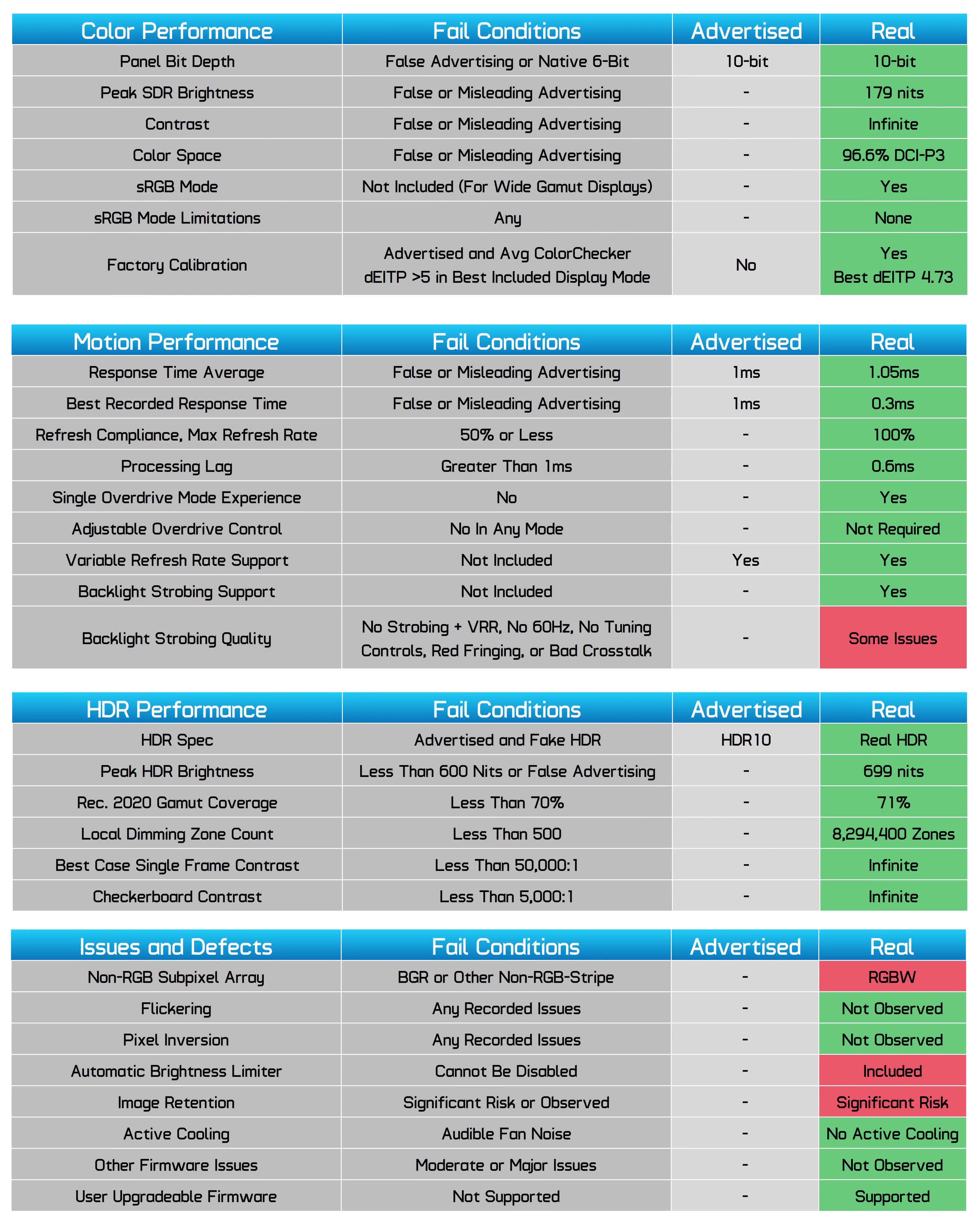 LG face o treabă grozavă cu secțiunile de performanță a culorii și a mișcării, atingând diferitele specificații anunțate. LG probabil a făcut alegerea corectă să nu vorbească despre luminozitate pe pagina cu specificații, mai degrabă decât să inducă în eroare clienții cu un număr fals dacă numerele nu erau atât de impresionante. Cu toate acestea, afirmația privind timpul de răspuns de 1 ms este perfectă și suntem impresionați că LG a decis să fie sincer aici, mai degrabă decât să spună că acesta este un monitor de 0,1 ms doar pentru a „învinge” LCD-urile mincinoase. Performanța HDR este, de asemenea, solidă.