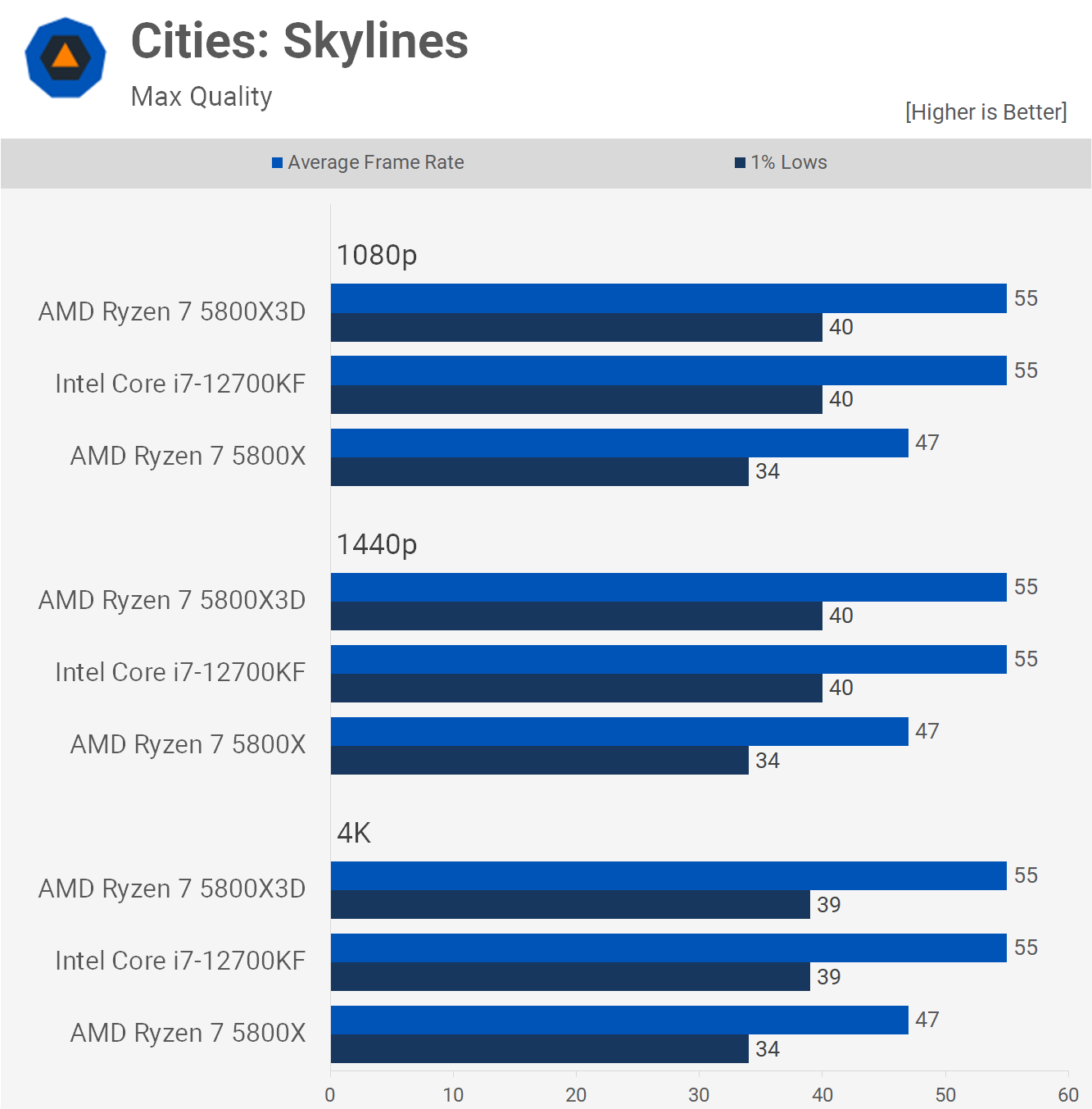Testări interesante cu Cities Skylines arată că 12700KF se potrivește cu 5800X3D, ceea ce îl face cu 18% mai rapid decât 5800X standard. Un rezultat solid aici pentru partea Core i7, cu atât mai mult când iei în considerare cât de mult este mai ieftin decât modelul 3D.