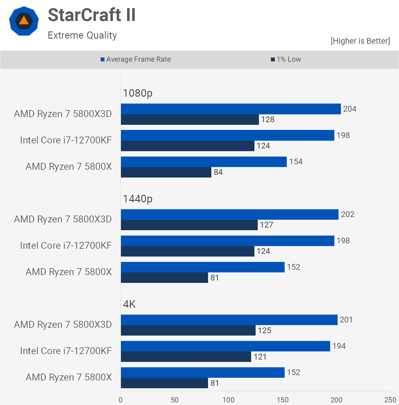 Un alt joc în care 12700KF funcționează foarte bine este StarCraft II, unde practic se potrivea cu 5800X3D, ceea ce este impresionant, având în vedere că versiunea 3D a fost cu peste 50% mai rapidă decât modelul standard.