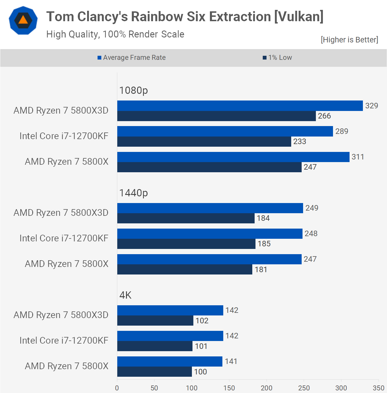 5800X și 12700KF sunt la gât în ​​Rainbow Six Siege, ambele cu doar 530 fps în medie la 1080p, făcând 5800X3D cu până la 13% mai rapid la această rezoluție. Până când atingem 1440p, suntem în întregime legat de GPU cu RTX 3090 Ti, așa că este greu de spus cât de util este avantajul de performanță oferit de V-Cache.
