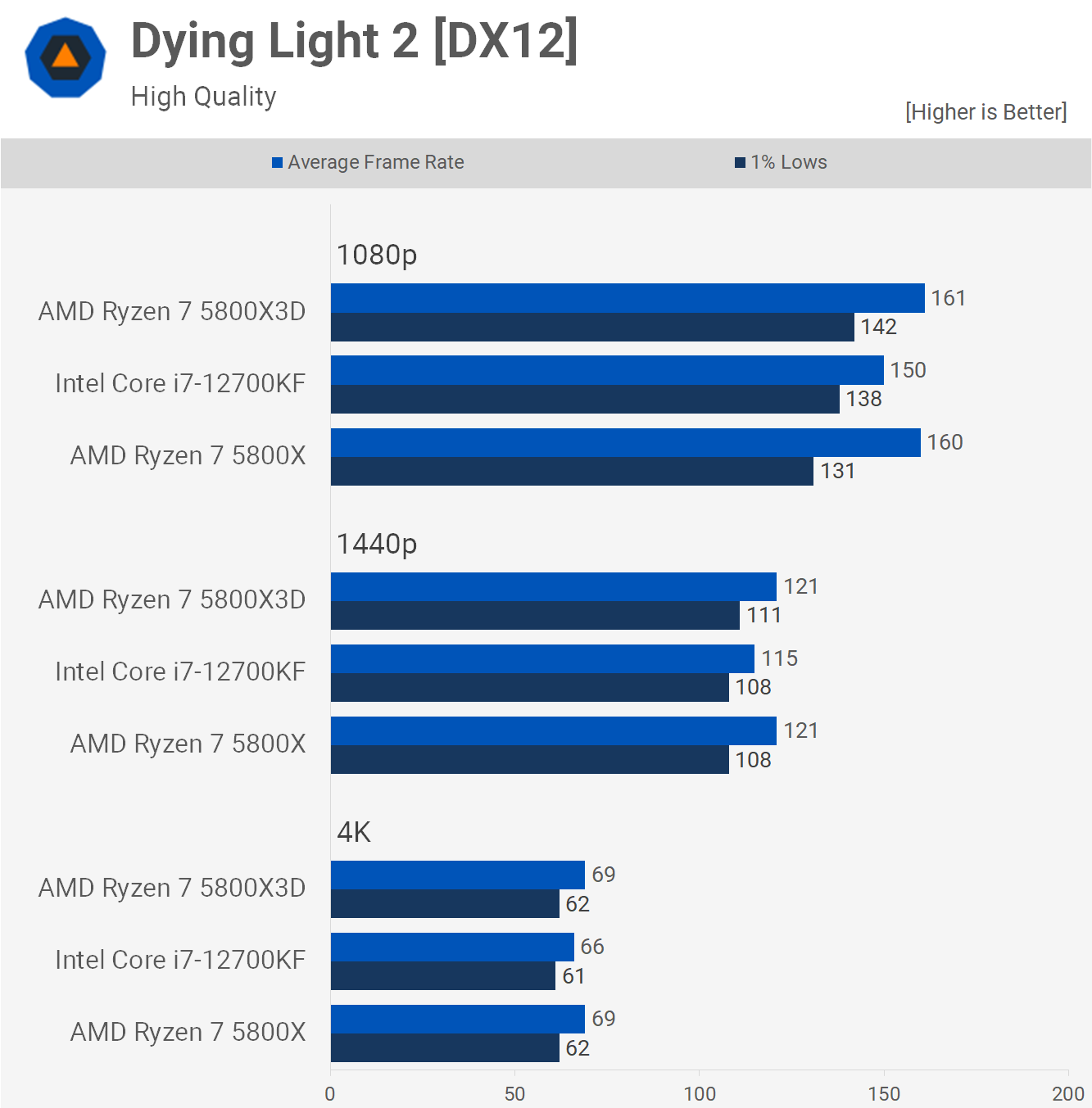 Dying Light 2 nu este tocmai un joc greu de CPU și, ca joc de rol de acțiune, survival horror, nu necesită exact sute de cadre pe secundă, așa că 160 fps la 1080p este probabil suficient și cu siguranță a fost suficient pentru a se potrivi cu 5800X3D. , deși minimele de 1% au fost cu 8% mai mici. Performanță încă comparabilă în general.