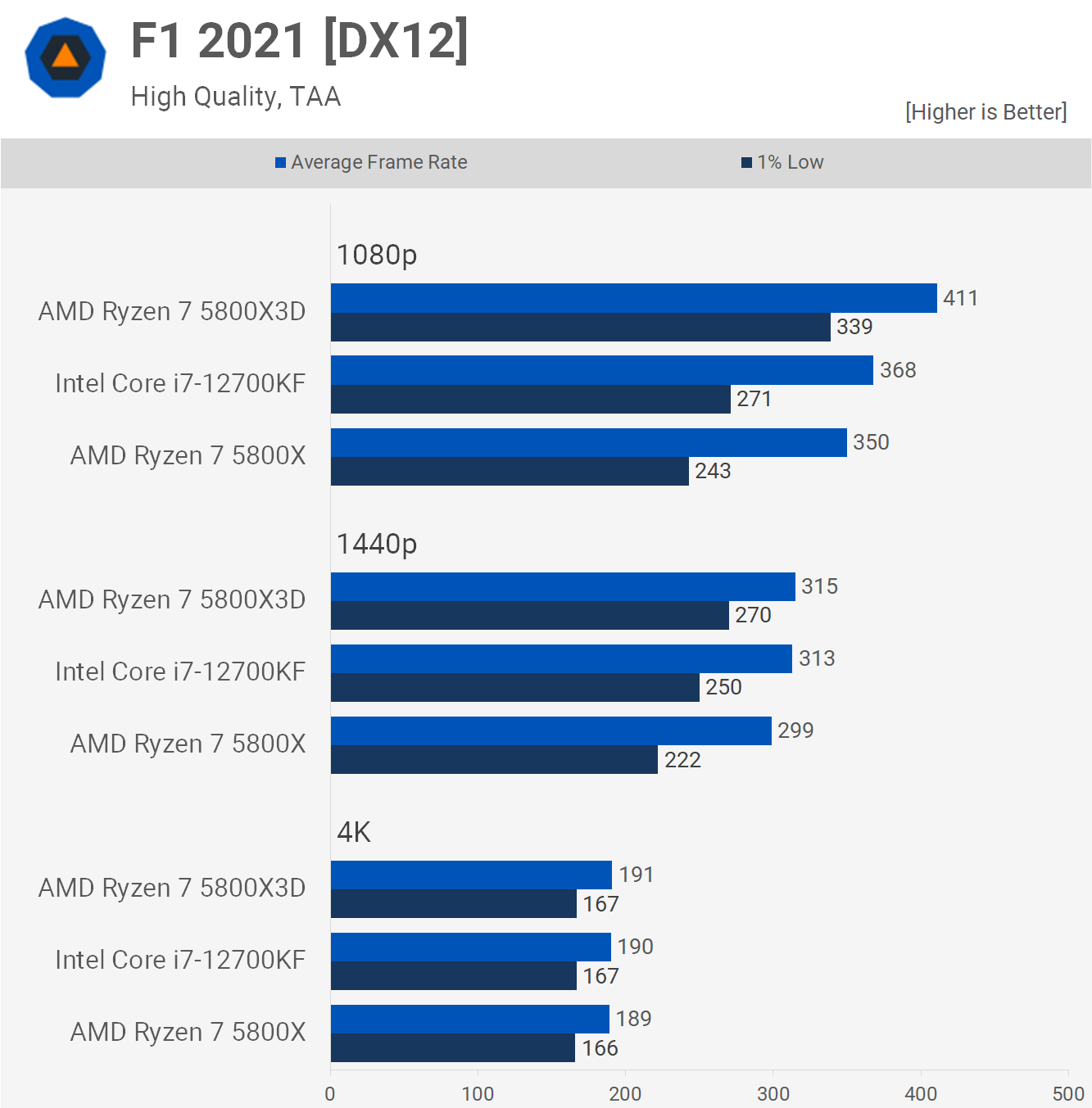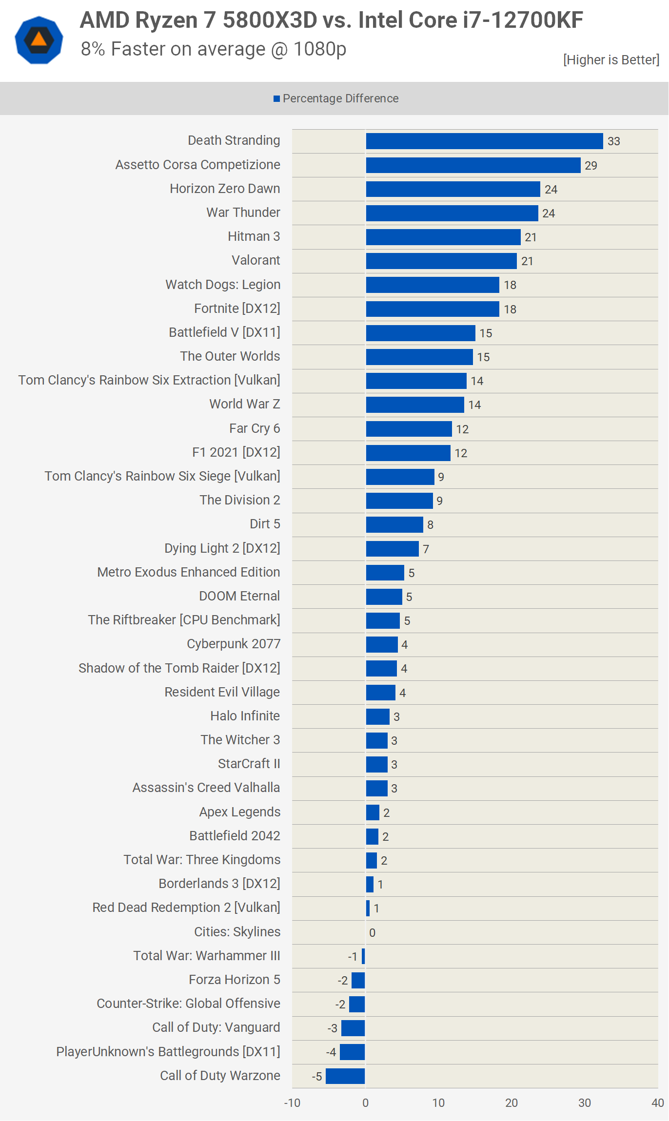 La 1080p, folosind GeForce RTX 3090 Ti, Ryzen 7 5800X3D a fost cu doar 8% mai rapid decât Core i7-12700KF în medie, deși a fost cu până la 33% mai rapid, văzut în Death Stranding. Au fost 14 jocuri în care marja a depășit 10% în favoarea modelului 5800X3D cu doar un singur joc în care 5800X3D a fost mai lent cu o marjă de 5% sau mai mare.