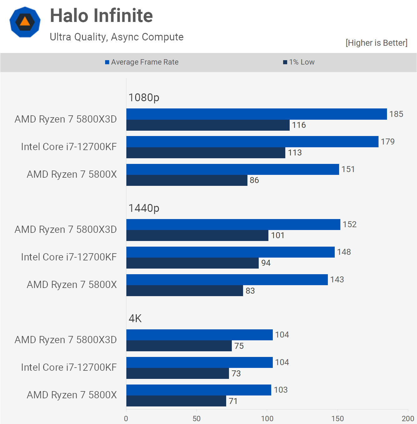 Halo Infinite joacă mai bine pe 12700KF, spre deosebire de 5800X, ne uităm la o creștere masivă de 31% a minimelor de 1% la 1080p, permițând procesorului Core i7 să se potrivească aproximativ cu 5800X3D, deci un rezultat bun pentru Intel.