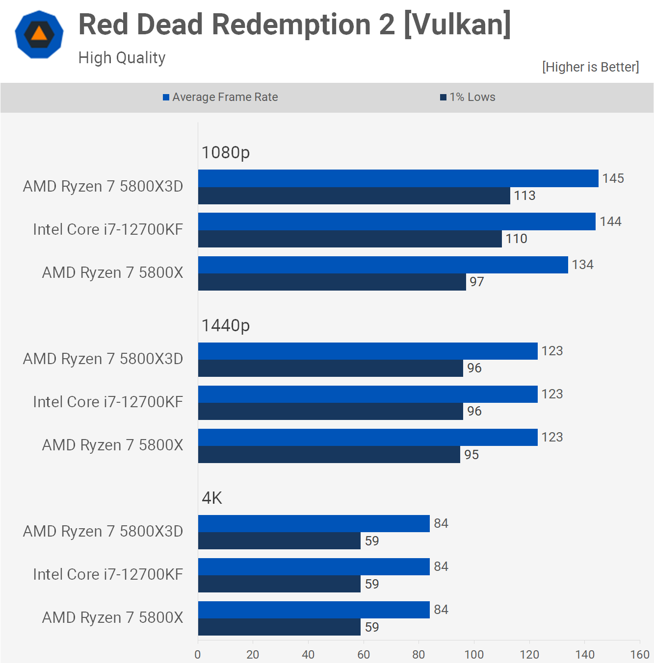 12700KF s-a potrivit și cu 5800X3D în Red Dead Redemption 2 la 1080p înainte de a deveni complet limitat GPU la 1440p și 4K. Ne uităm la o îmbunătățire cu 13% a reducerilor de 1% la 1080p, ceea ce face ca procesorul Core i7 să fie cu doar 3% mai lent decât 5800X3D.