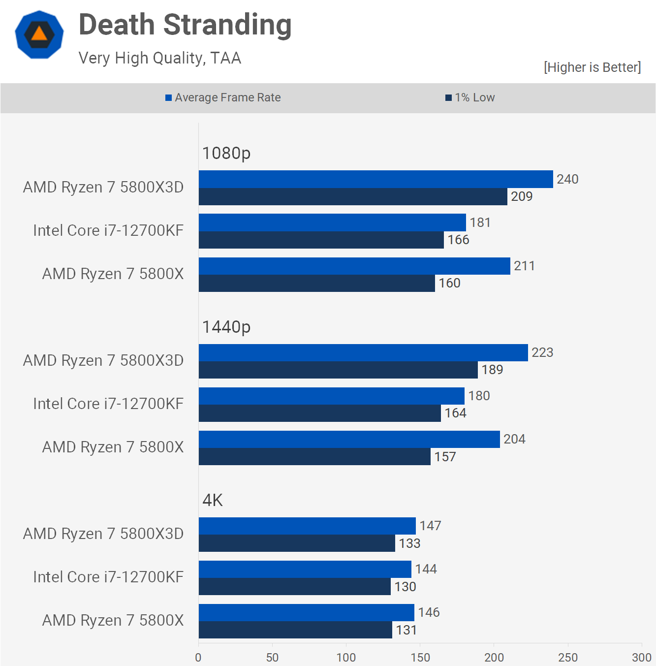 În ultimul rând, avem Death Stranding și aici procesoarele Intel se comportă destul de ciudat, oferind performanțe relativ puternice, cu 1% scăzute, cu performanțe slabe ale ratei de cadre medii. Ca rezultat, 12700KF a fost cu 4% mai rapid decât 5800X la 1080p când se uită la minime de 1%, dar cu 14% mai lent pentru rata medie a cadrelor. Acest lucru a însemnat că 5800X3D a fost cu până la 31% mai rapid decât procesorul Core i7. Bineînțeles, acesta este un joc pentru un singur jucător, așa că apariția peste 160 fps în testarea noastră la 1080p este probabil mai mult decât suficientă pentru acest titlu.