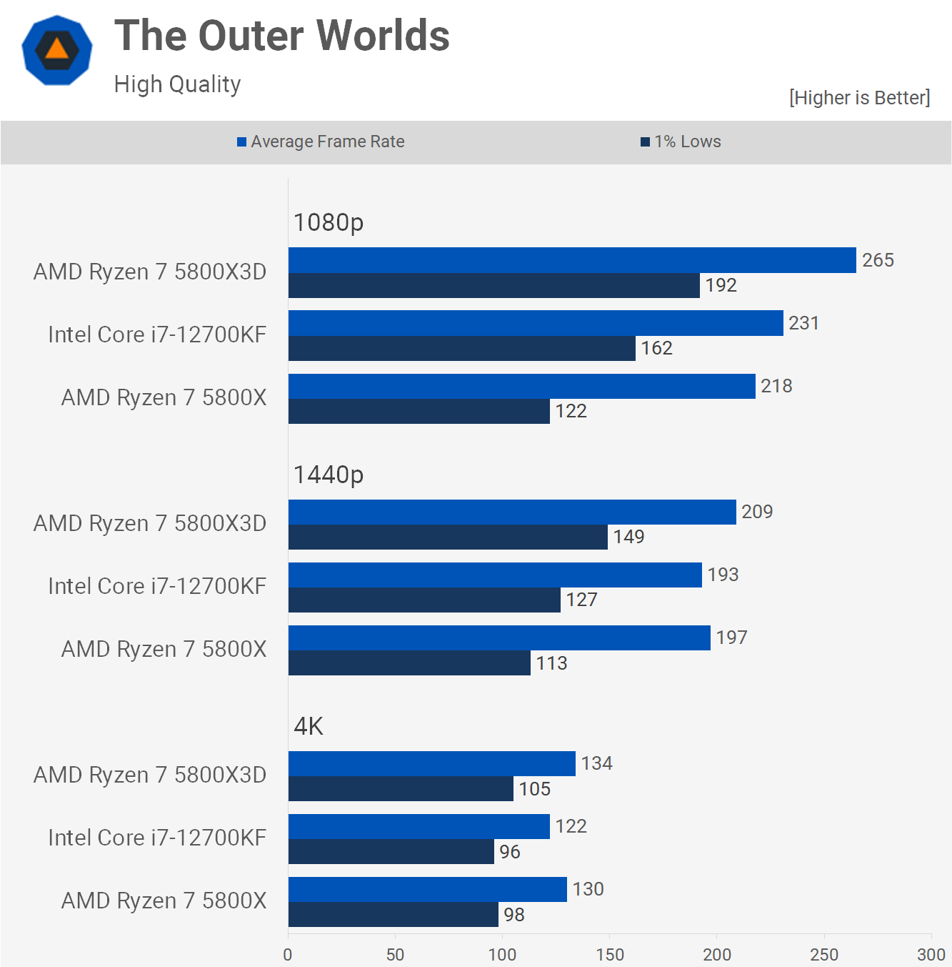 Ultimul joc pe care îl vom analiza este The Outer Worlds și acesta este unul în care 5800X3D a fost cu până la 57% mai rapid decât 5800X. 12700KF este mult mai rapid decât 5800X, dar chiar și așa 5800X3D a reușit totuși să mărească 1% minime cu 19% la 1080p și a fost chiar cu 17% mai rapid la 1440p.