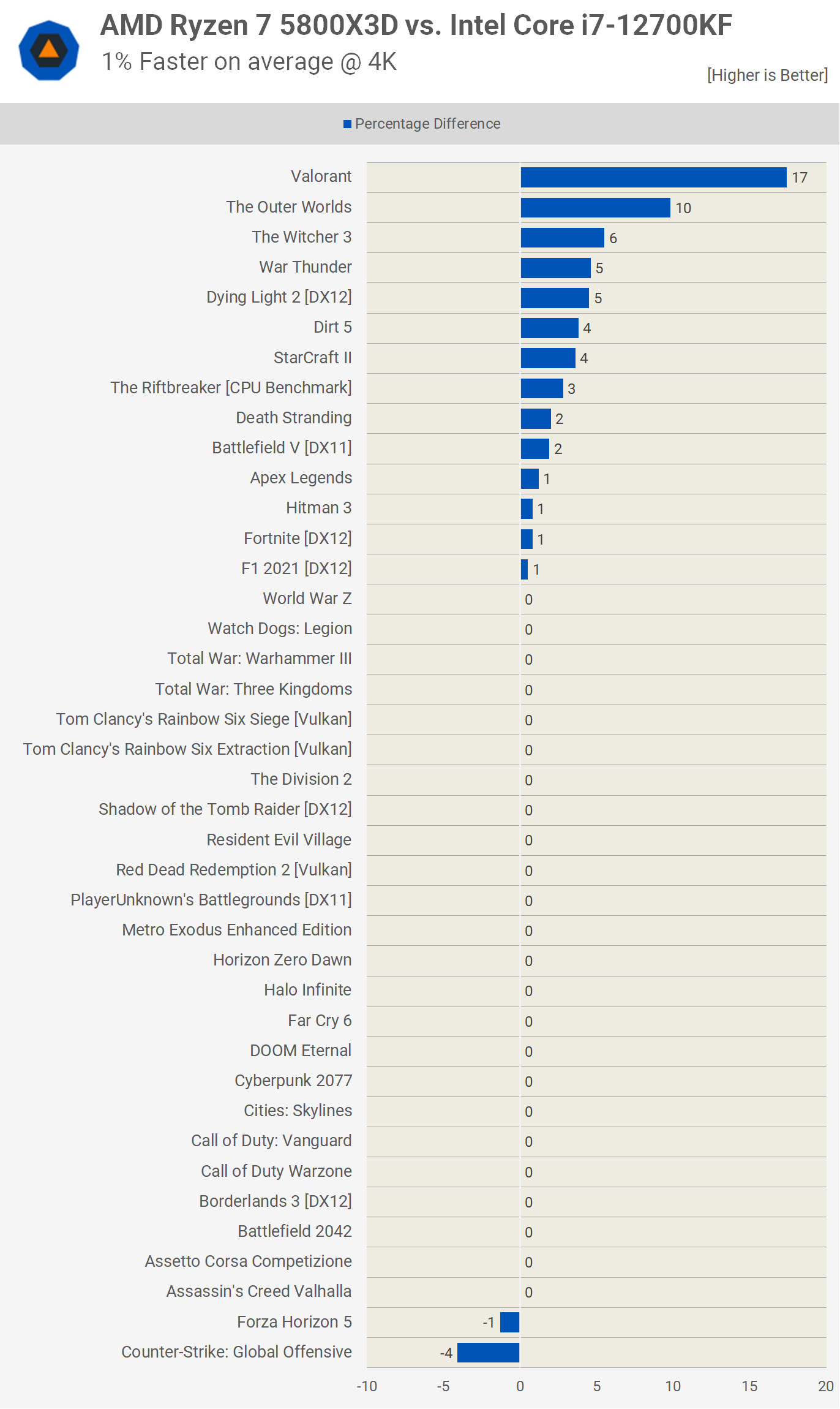 După cum era de așteptat, la 4K, 5800X3D a fost cu doar 1% mai rapid în medie, iar acum marea majoritate a jocurilor testate au fost în întregime legate de GPU.