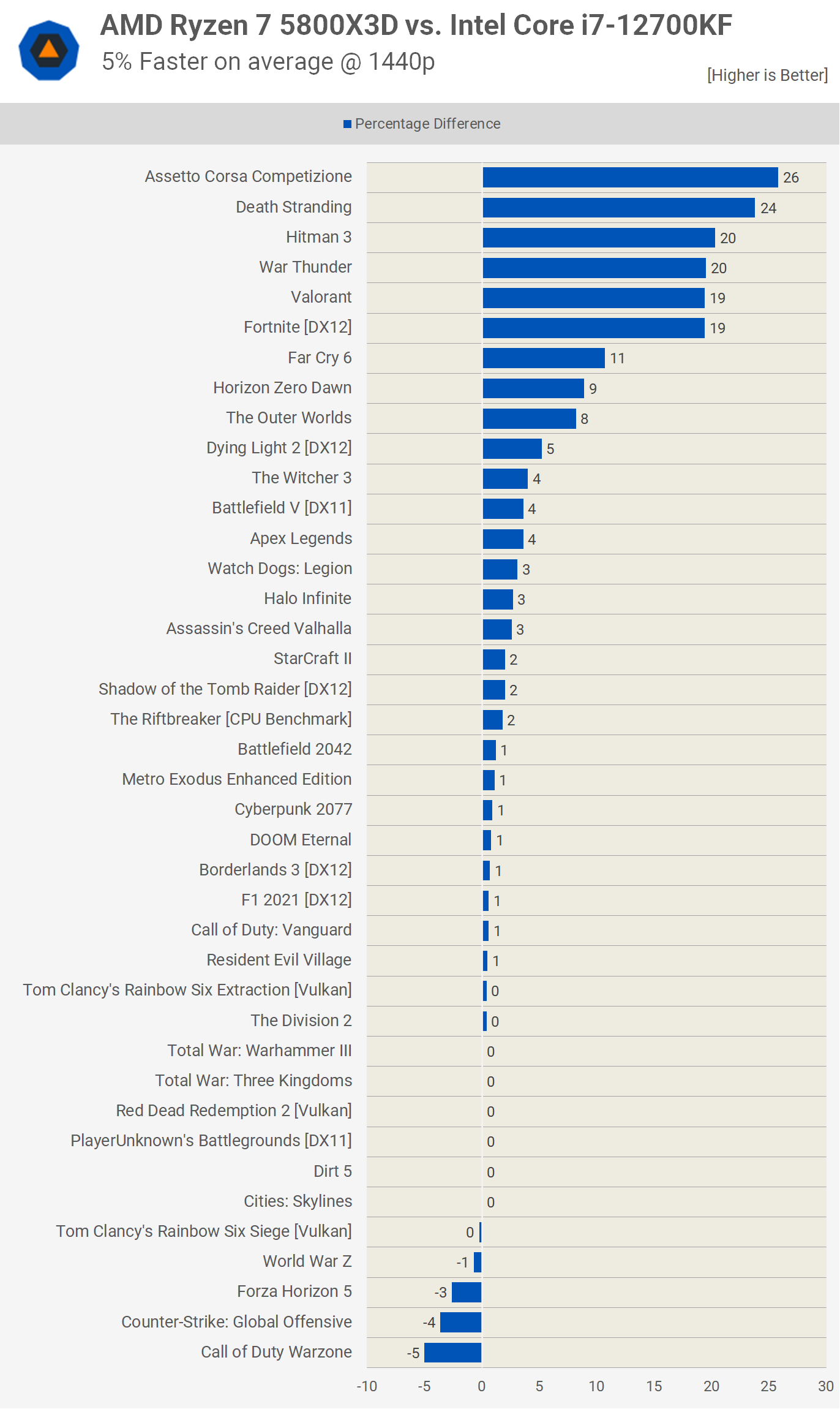 La cea mai populară rezoluție de 1440p pentru jocurile de ultimă generație, procesorul joacă un rol mai puțin pe măsură ce jocurile devin mai mult legate de GPU, chiar și cu un RTX 3090 Ti. Aici 5800X3D a fost cu doar 5% mai rapid în medie, cu doar 7 jocuri în care observăm marje cu două cifre.