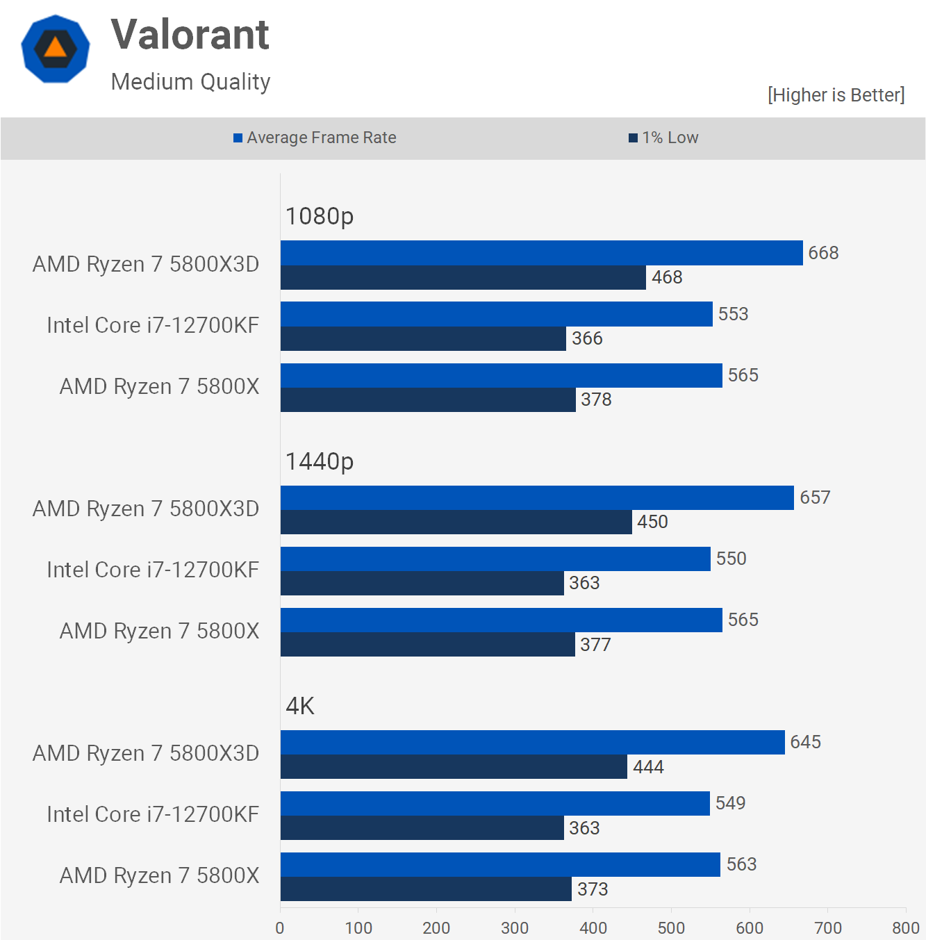 Începând cu Valorant, vedem că 5800X și 12700KF sunt egale, CPU Ryzen 7 original câștigând doar cu câteva procente. Așa fiind, 5800X3D a fost cu până la 28% mai rapid la 1080p când se uită la minimele de 1% și chiar și la 4K și-a menținut o marjă de 22%. O victorie clară pentru 5800X3D, deși nu suntem siguri câți dintre voi veți observa diferența, dar voi lăsa asta la latitudinea jucătorilor profesioniști dintre voi să decidă.