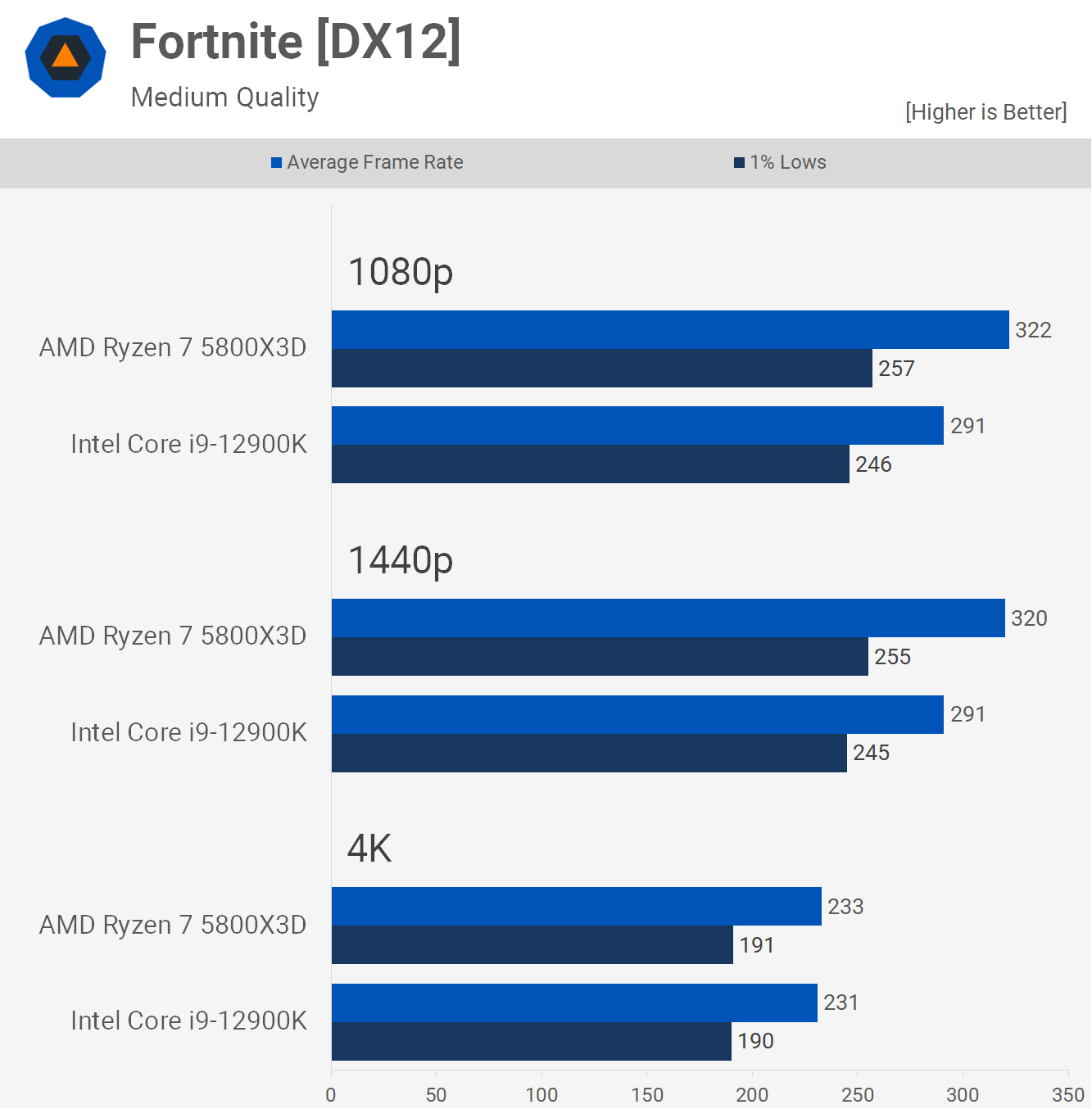 Fortnite preferă, de asemenea, 5800X3D la 1080p și 1440p, deși o face mai mult pentru rata medie de cadre decât pentru minimele de 1%. Aici procesorul Ryzen 7 a fost cu până la 11% mai rapid și abia până când sărim la rezoluția 4K marja este neutralizată și acum ambele procesoare sunt limitate la același nivel de performanță.