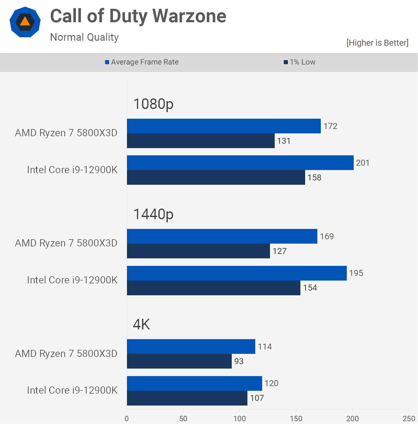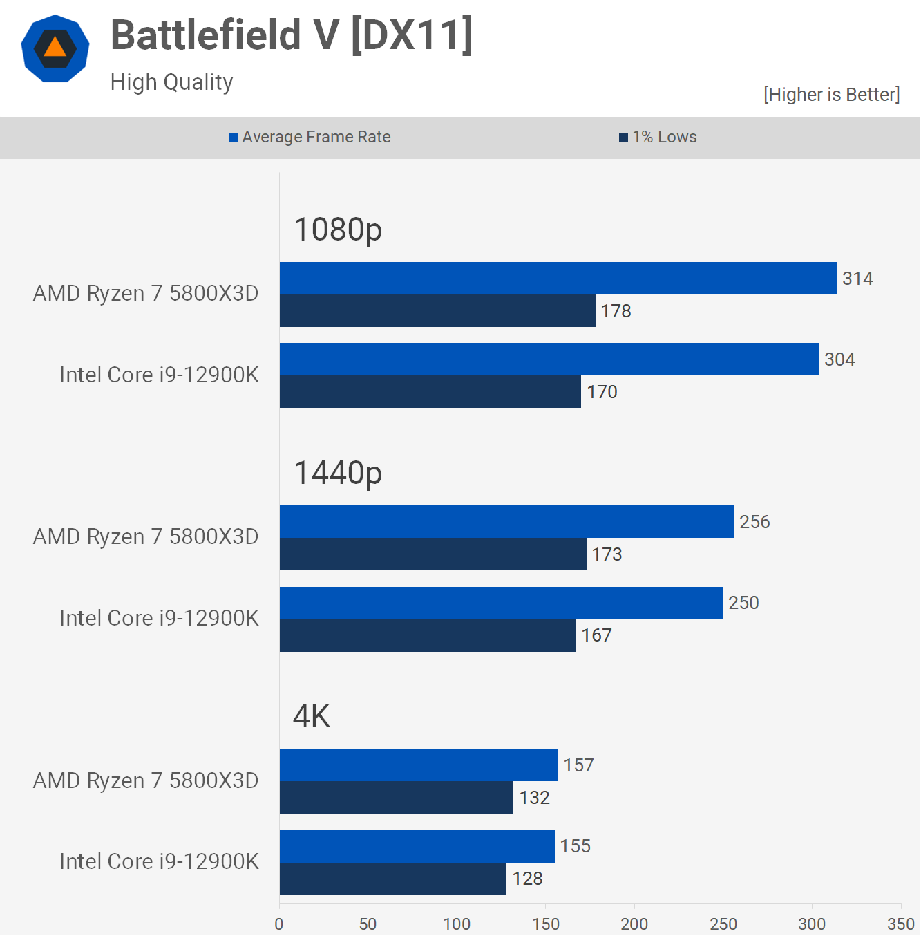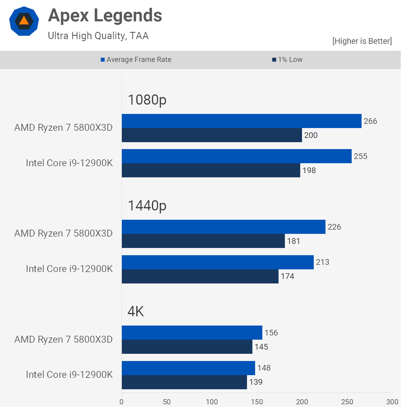 Apex Legends rulează puțin mai bine pe 5800X3D, oferind un mic avantaj de performanță față de 12900K, chiar și la 4K. Ne uităm la o creștere de 4% la 1080p, 6% la 1440p și 5% la 4K. Cu siguranță nu veți observa o diferență, dar procesorul AMD este mai rapid din punct de vedere tehnic aici.