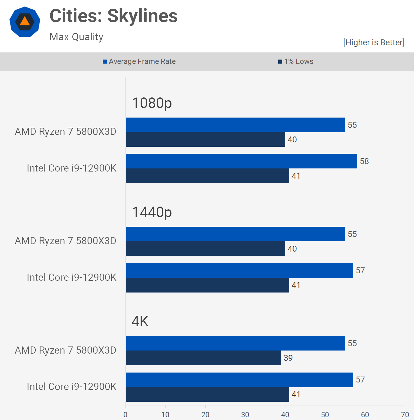 Ca rezultat, jocul este foarte limitat de procesor, iar memoria cache L3 masivă a 5800X3D nu îl ajută să treacă înaintea lui 12900K. Cu siguranță ar putea ajuta în raport cu 5800X, dar nu avem încă aceste date. Când vine vorba de performanța Cities Skylines, aceste două procesoare se potrivesc strâns și ambele nu au reușit să atingă 60 fps, deși nu aveți nevoie de rate mari de cadre pentru a vă bucura de acest joc.