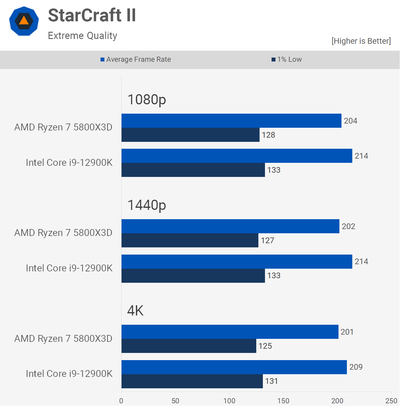 StarCraft II utilizează doar un singur nucleu și, în timp ce ratele de cadre sunt mult mai mari, jocul este foarte limitat de procesor. 12900K a fost cu 5% mai rapid, dar ambele procesoare au depășit 200 fps în benchmark-ul nostru de reluare la mijlocul jocului.
