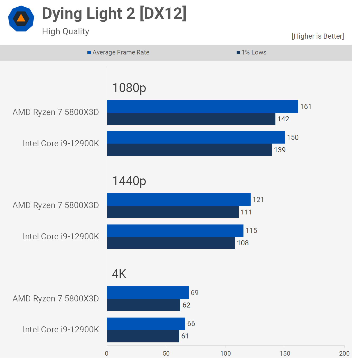 Spre deosebire de Apex Legends, Dying Light 2 nu este un joc în care aveți nevoie de sute de cadre pe secundă, așa că fie CPU funcționează bine, în ciuda faptului că 5800X3D a fost puțin mai rapid.