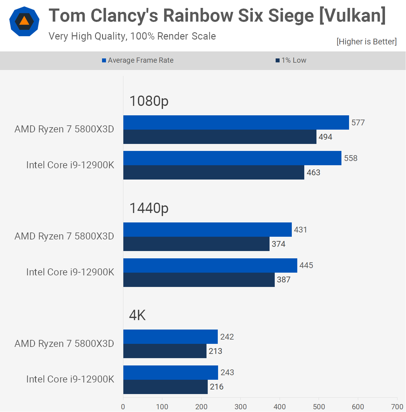 Rainbow Six Siege este un joc competitiv, așa că pentru acest test am optat pentru setări de calitate ușor reduse cu presetarea de foarte înaltă calitate, opusă ultra. Suntem doar GPU limitati la 4K și chiar și acolo ratele de cadre au depășit 200 fps. La 1080p, 5800X3D a fost cu 3% mai rapid, dar apoi cu 3% mai lent la 1440p.