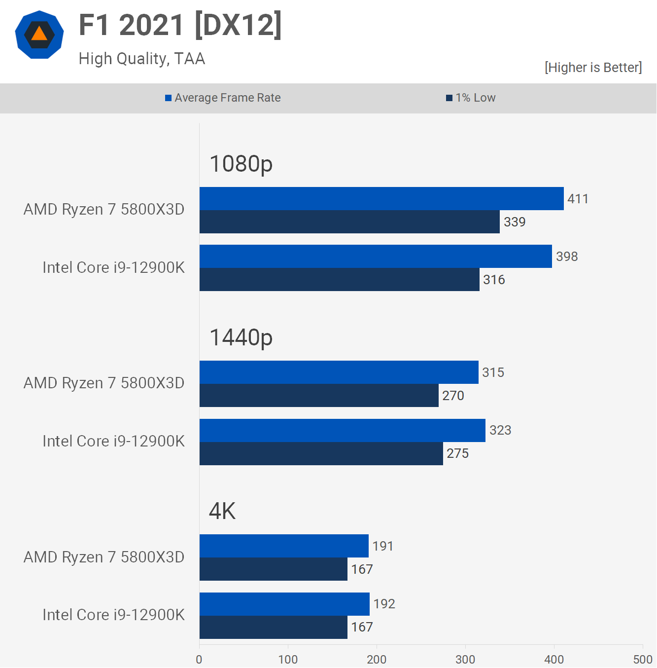 F1 2021 a fost testat folosind presetarea de înaltă calitate și ne uităm la mult peste 300 fps la 1080p. 5800X3D a fost mai rapid din punct de vedere tehnic, dar vorbim despre o mică creștere cu 3% a ratei medii de cadre și o creștere cu 7% la minime de 1%. La 1440p, 12900K a crescut înainte cu doar 3%, iar la GPU, performanța limitată la rezoluția 4K a fost identică.