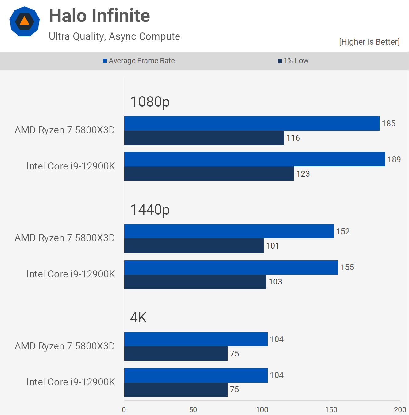 În Halo, 12900K a fost cu până la 6% mai rapid, dar performanța generală a fost aproape aceeași. La 1440p, ne uităm la peste 150 fps în medie, cu doar câteva cadre care separă fiecare procesor. Chiar și la 4K, ratele de cadre au rămas peste 100 fps.