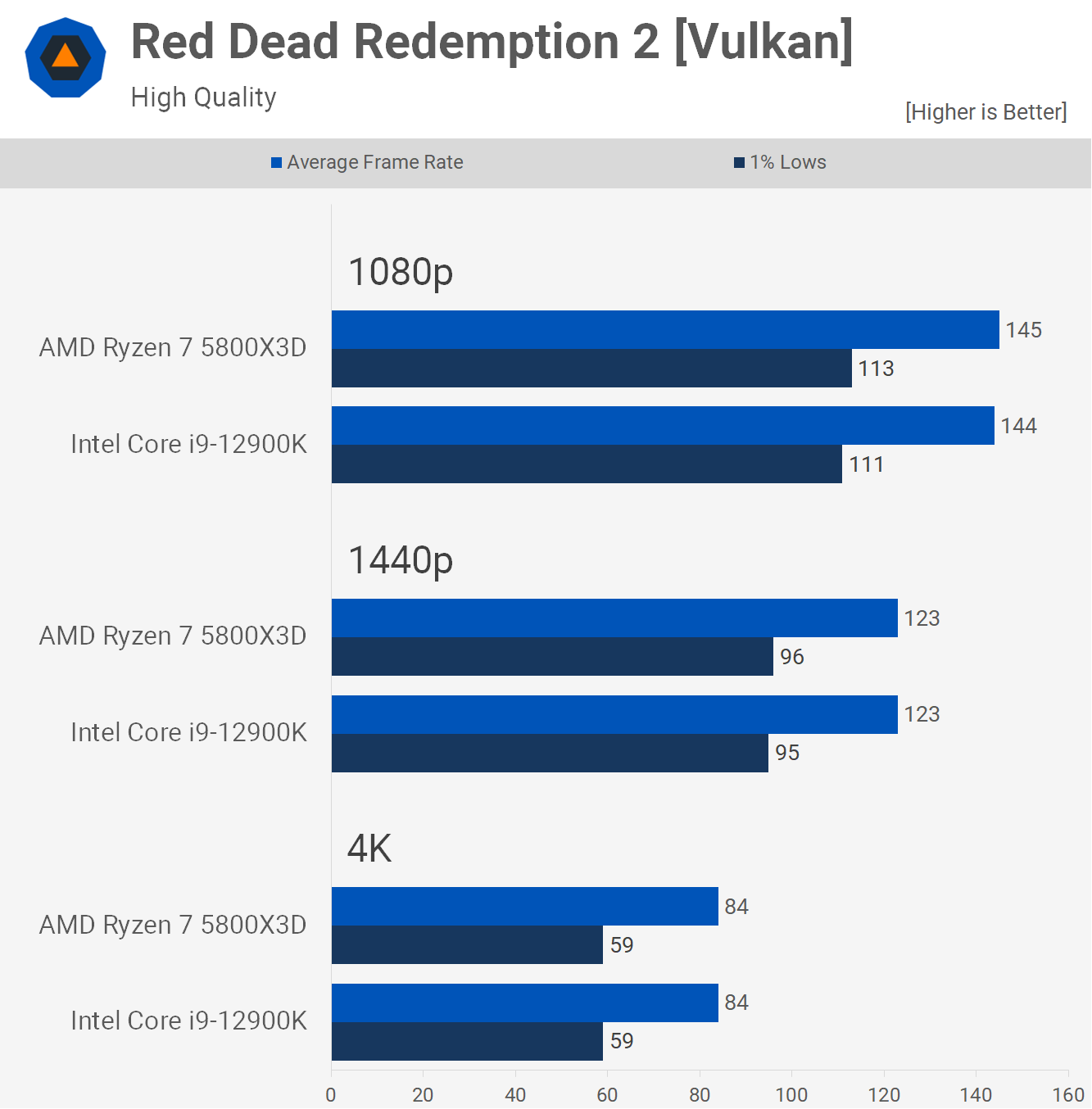 Este o poveste similară în Red Dead Redemption 2 folosind setările de înaltă calitate. Performanța este identică, cu doar 1-2 fps la 1080p și nimic la 1440p și 4K.