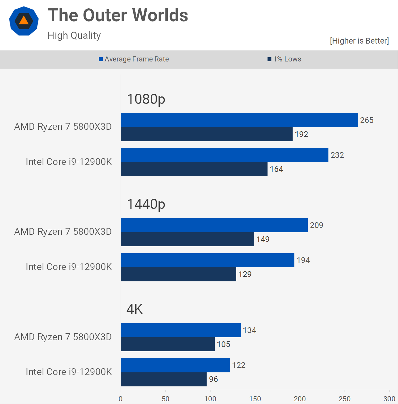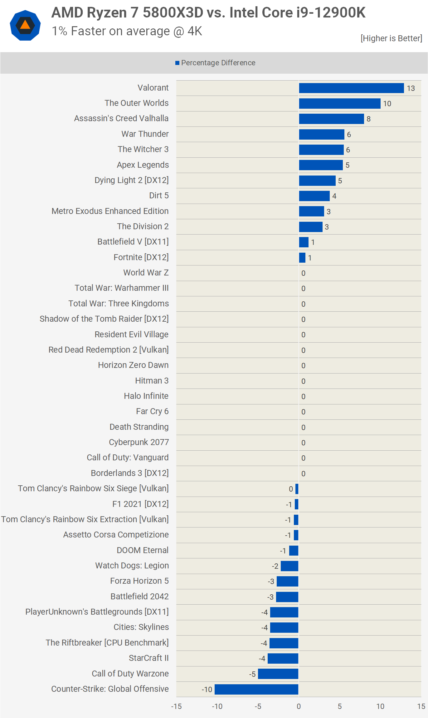 La 4K, Valorant și The Outer Worlds au fost cele mai bune titluri pentru AMD, CSGO fiind singurul joc în care marja sa extins la o pierdere de două cifre. În general, 5800X3D a fost cu doar 1% mai rapid, ceea ce înseamnă că performanța a fost aproximativ aceeași în ansamblu.