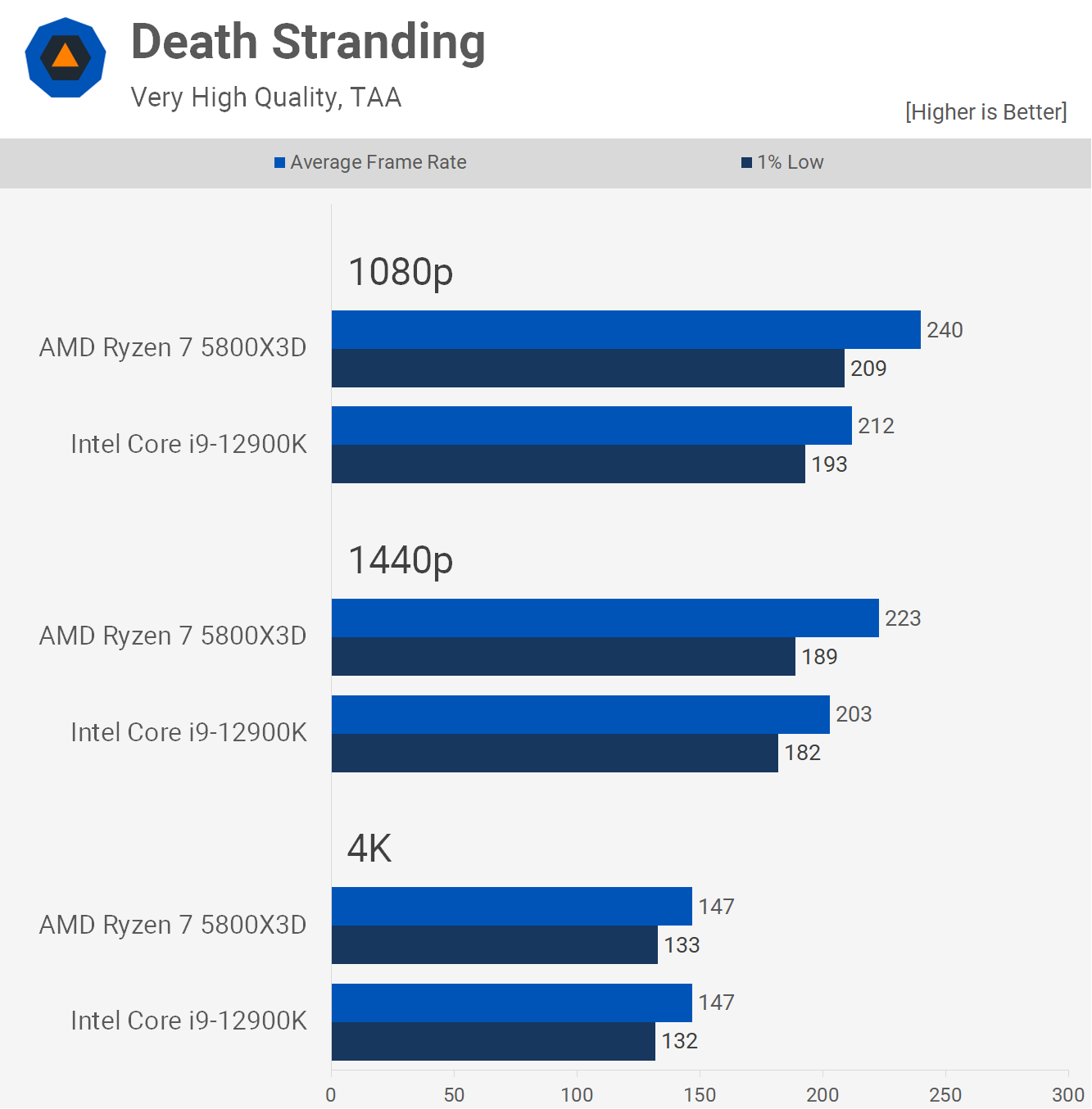 În Death Stranding, 12900K a limitat performanța la 1080p la 212 fps, făcând 5800X3D cu 13% mai rapid, iar această marjă a fost doar puțin redusă la 10% la 1440p. Apoi, la 4K, suntem complet legati de GPU, încheind lucrurile la 147 fps.