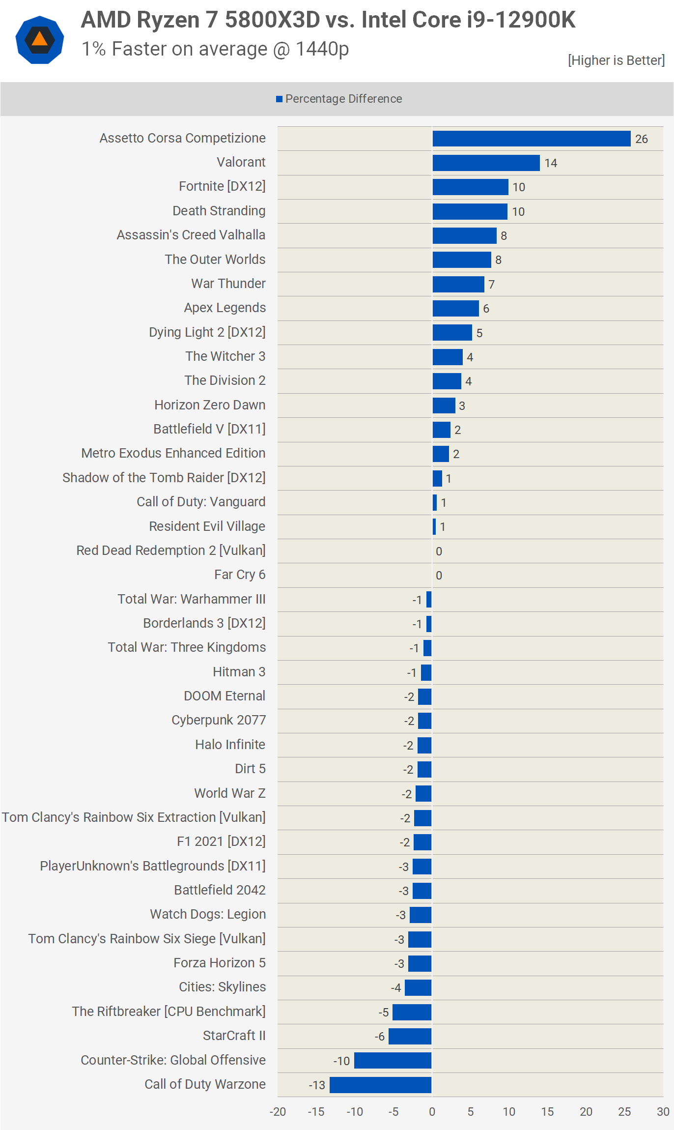 Începând cu rezultatele 1080p, vedem că 5800X3D a fost cu doar 1% mai rapid în medie, dar acesta este un rezultat impresionant, având în vedere că procesorul Ryzen folosește memorie DDR4-3800 CL16, în timp ce 12900K a fost asociat cu o memorie DDR5-6400 CL32 mult mai scumpă. . 5800X3D s-a bucurat de victorii mari în ACC, Valorant, The Outer Worlds și Death Stranding, în timp ce a fost cu 14% mai lent în Hitman 3 și Warzone.