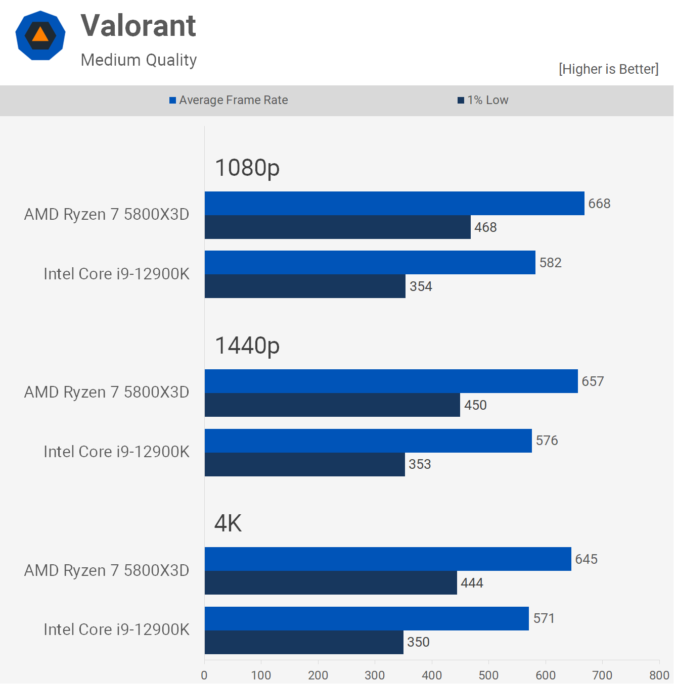 Începând cu Valorant, folosind setări de calitate medie, având în vedere că acesta este un titlu competitiv, 5800X3D împinge RTX 3090 Ti la 668 fps în medie la 1080p, ceea ce îl face cu 15% mai rapid decât 12900K, folosind memoria DDR5-6400 sau cu 32% mai rapid când comparăm datele scăzute cu 1%, ceea ce reprezintă o îmbunătățire semnificativă a performanței, deși procesorul Core i9 a permis în permanență peste 300 fps în timpul testării noastre.