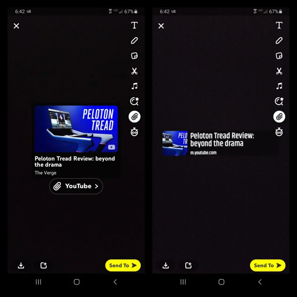 Noul autocolant YouTube al Snapchat (stânga) față de un videoclip YouTube adăugat ca link în Snapchat (dreapta). Captură de ecran: Snapchat