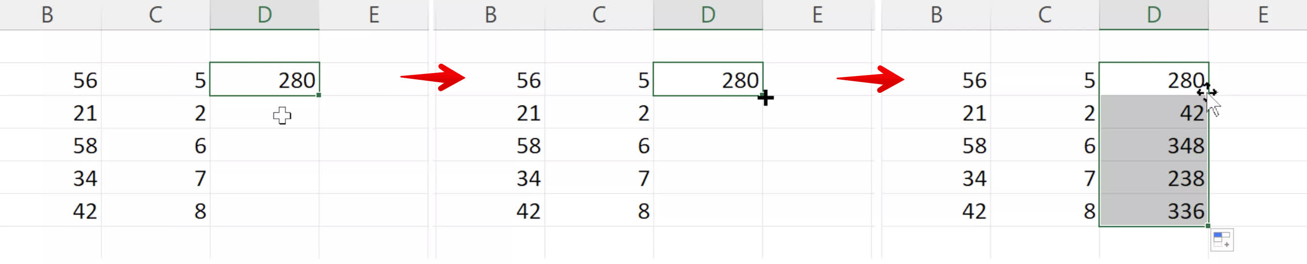 Pur și simplu plasați cursorul mouse-ului peste colțul din dreapta jos al celulei – cursorul își va schimba forma și culoarea.