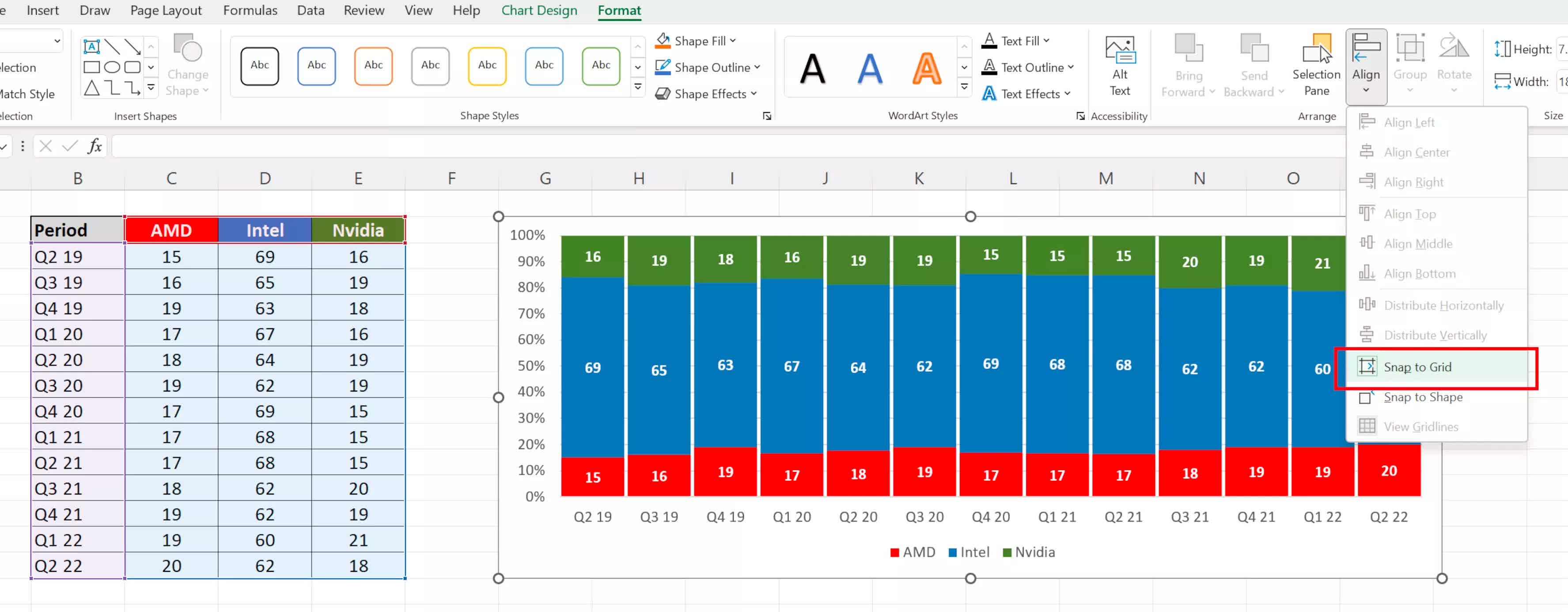 Graficele încorporate în foile de lucru pot fi aliniate cu granițele celulei fie ținând apăsat ALT când o mutați, fie activând Snap to Grid în opțiunile de format ale graficului (faceți clic pe grafic, apoi apăsați ALT, J, A, A, A, P ).