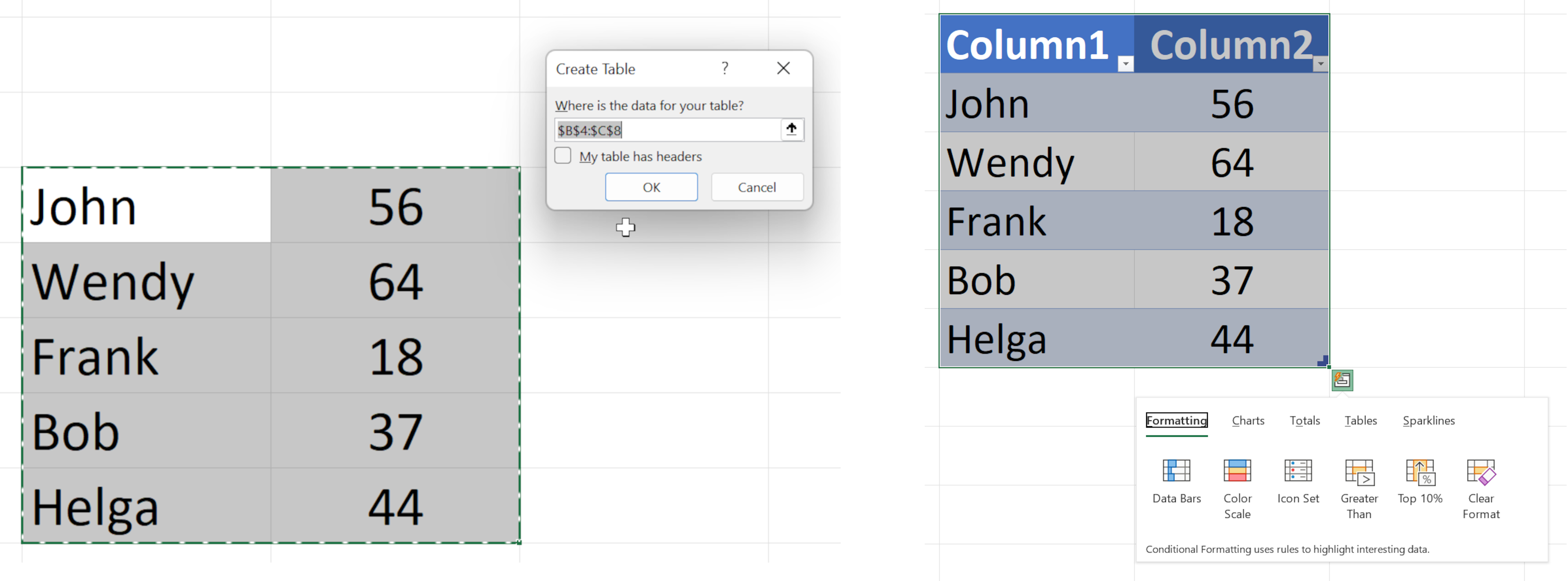 Cu tabelul terminat, faceți clic dreapta pe orice parte a acestuia și selectați opțiunea Analiză rapidă din mijloc. Aici, puteți modifica rapid formatul tabelului, puteți adăuga câteva calcule automate și formatare condiționată, diagrame și un tabel pivot.