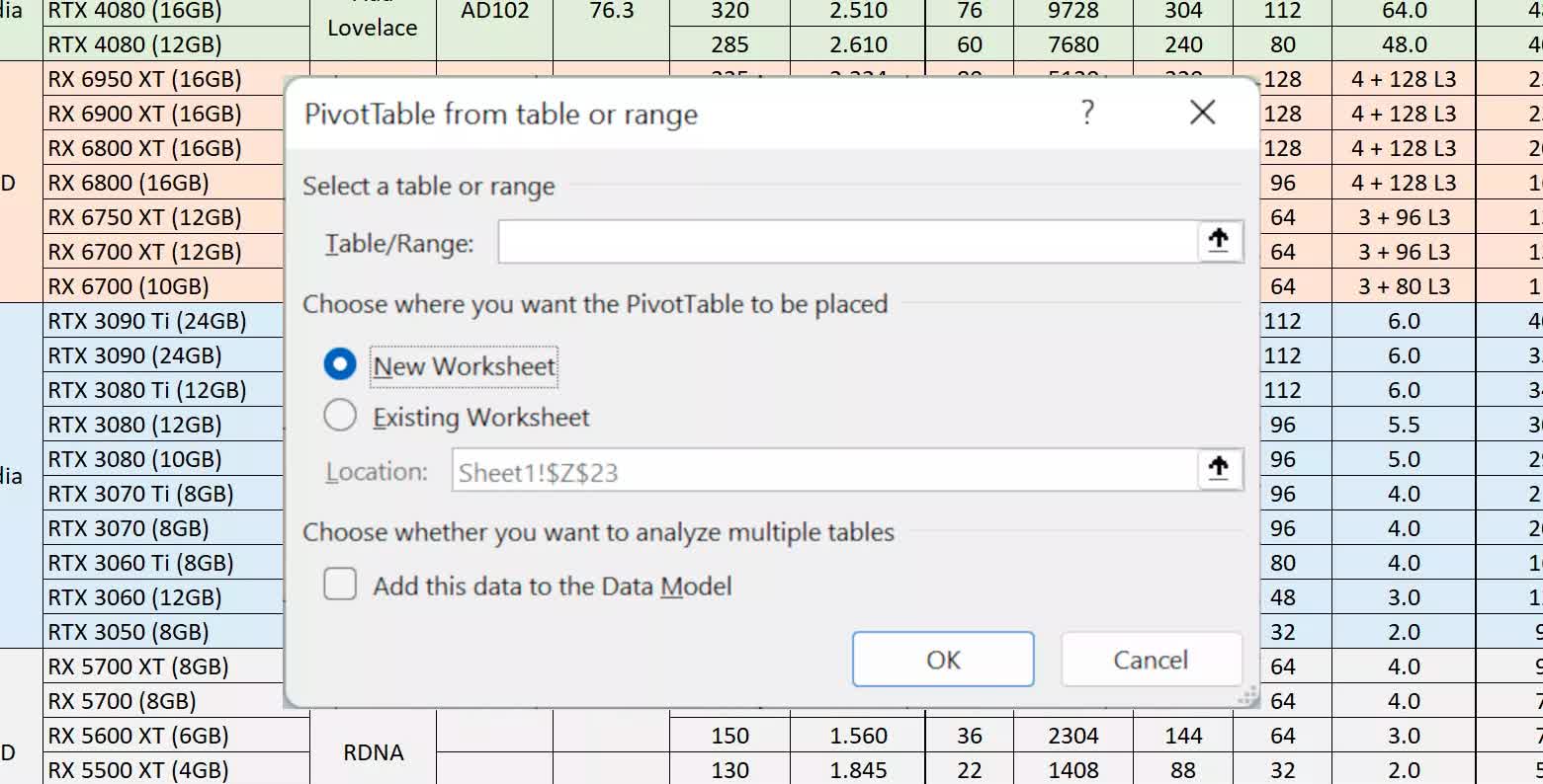 Se va deschide o fereastră nouă, asigurați-vă că selectați întregul tabel, inclusiv toate anteturile de coloană și rând. Apoi decideți dacă doriți ca tabelul pivot să fie în aceeași foaie de lucru sau în una nouă și apăsați Enter.