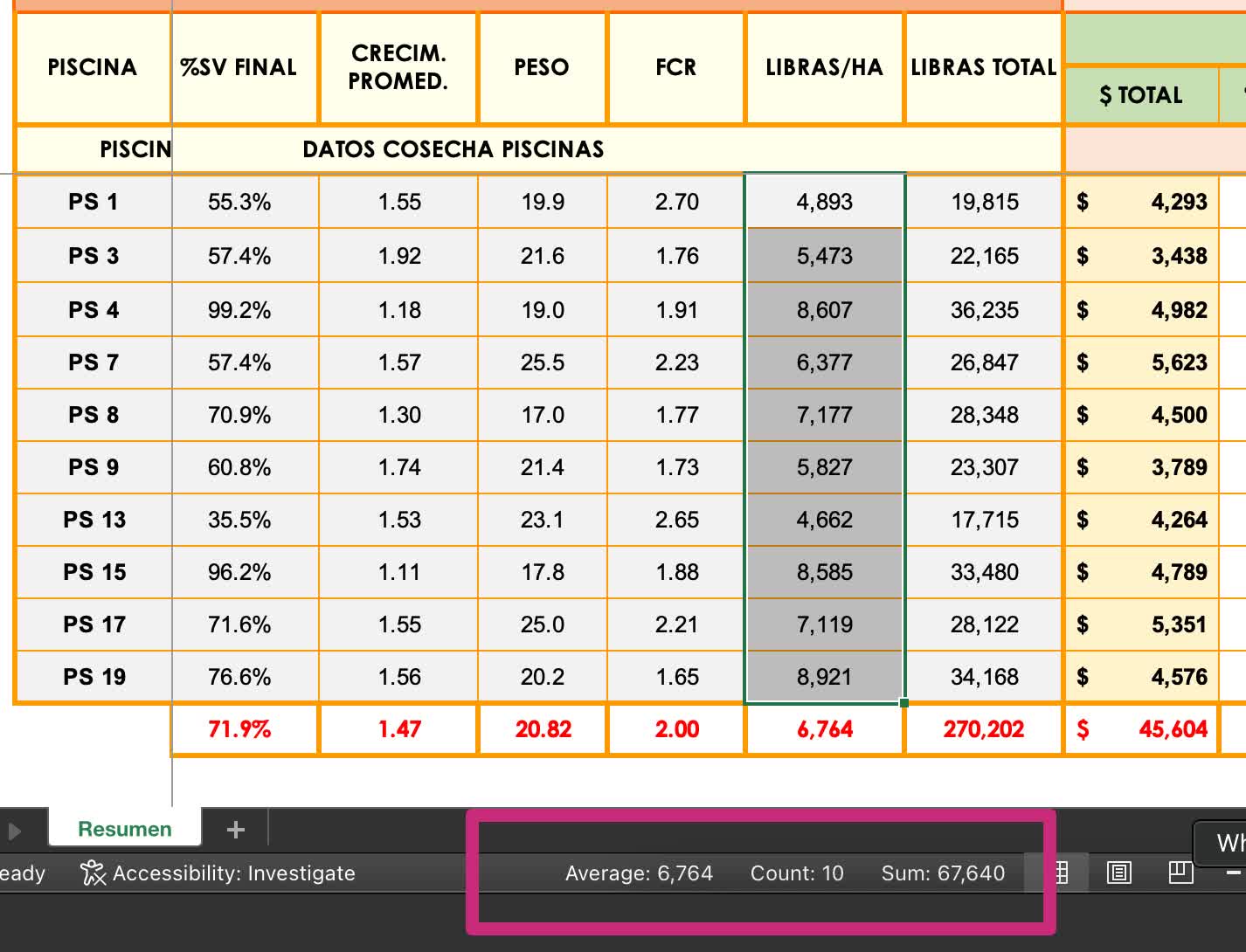 Evidențiați valorile pe care doriți să le examinați și apoi priviți bara de jos a ferestrei Excel…