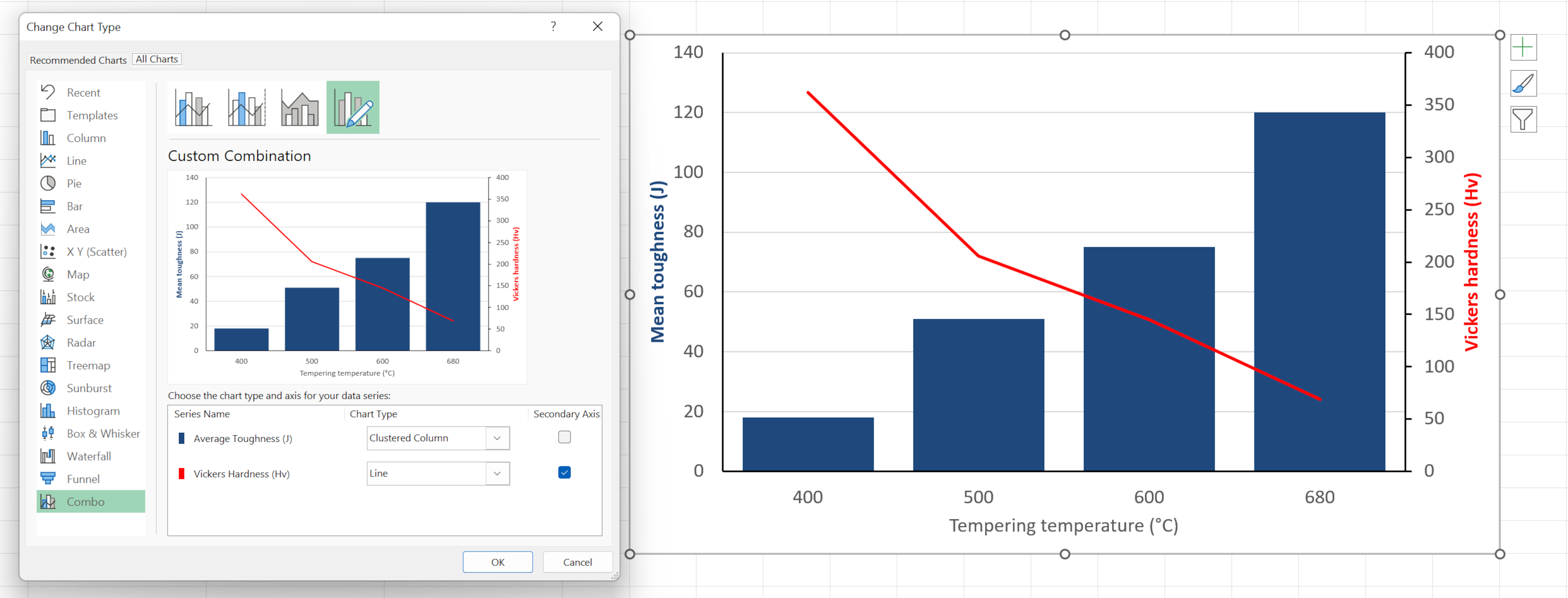 Dacă doriți să afișați două tipuri de diagrame diferite în același, puteți face acest lucru evidențiind datele pe care doriți să le afișați pe aceeași diagramă, apoi selectând Combo din fereastra de selecție a diagramei (ALT, N, K).