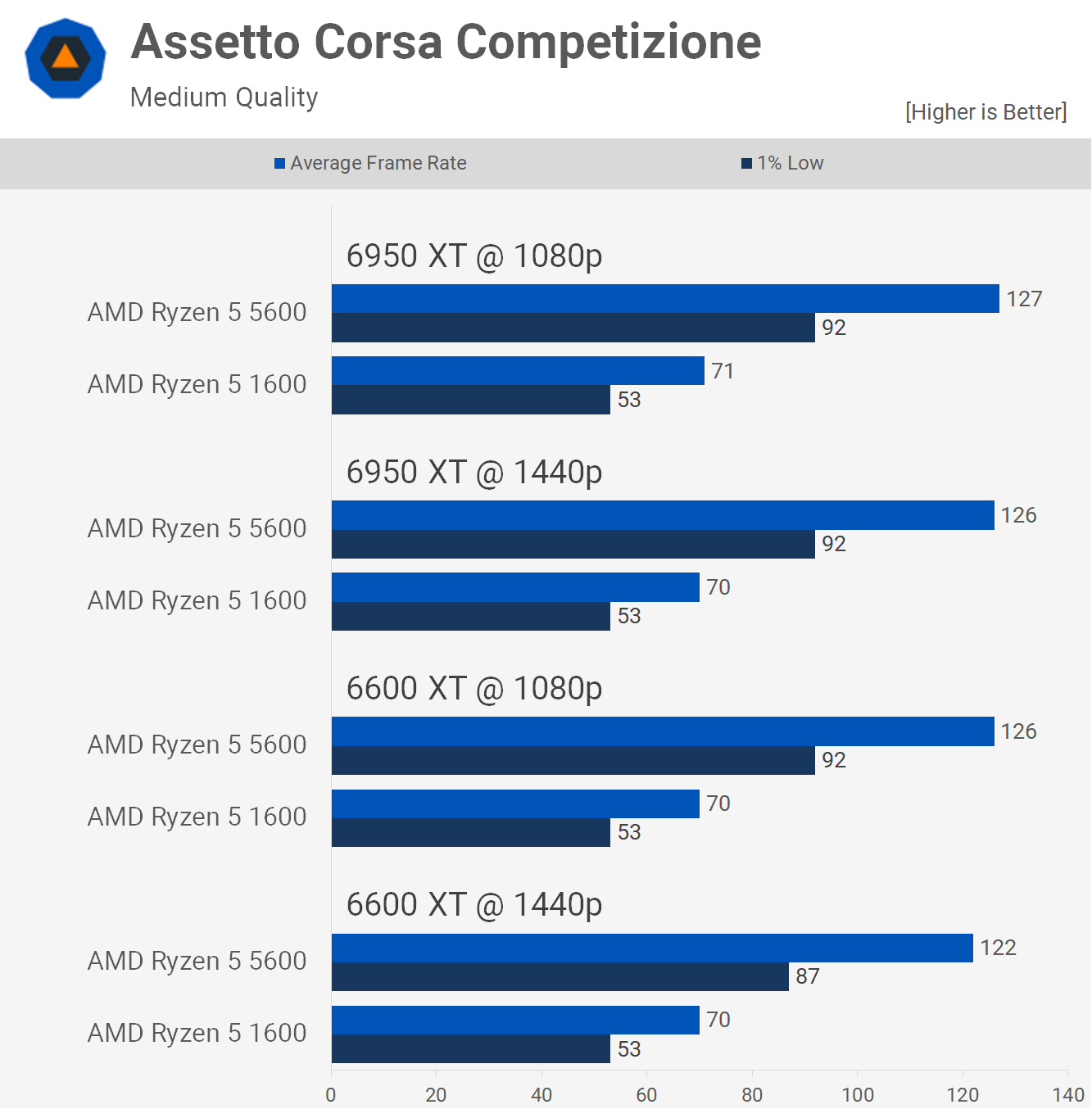 Pentru o conducere serioasă, avem rezultatele ACC. Ryzen 1600 este redabil aici, dar performanța este puțin mizerabilă. După cum am descoperit recent, performanța memoriei cache joacă un rol cheie pentru acest titlu și aceasta este o mare parte din motivul pentru care 5600 este mult mai rapid.