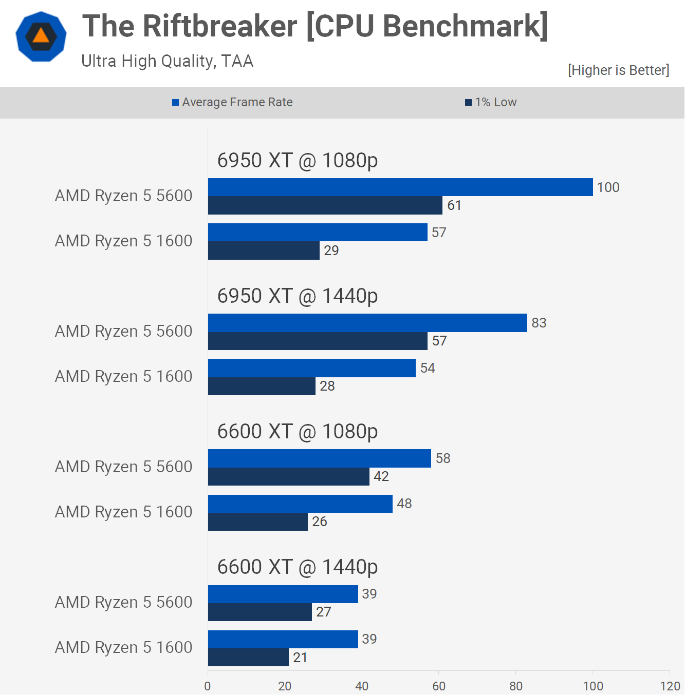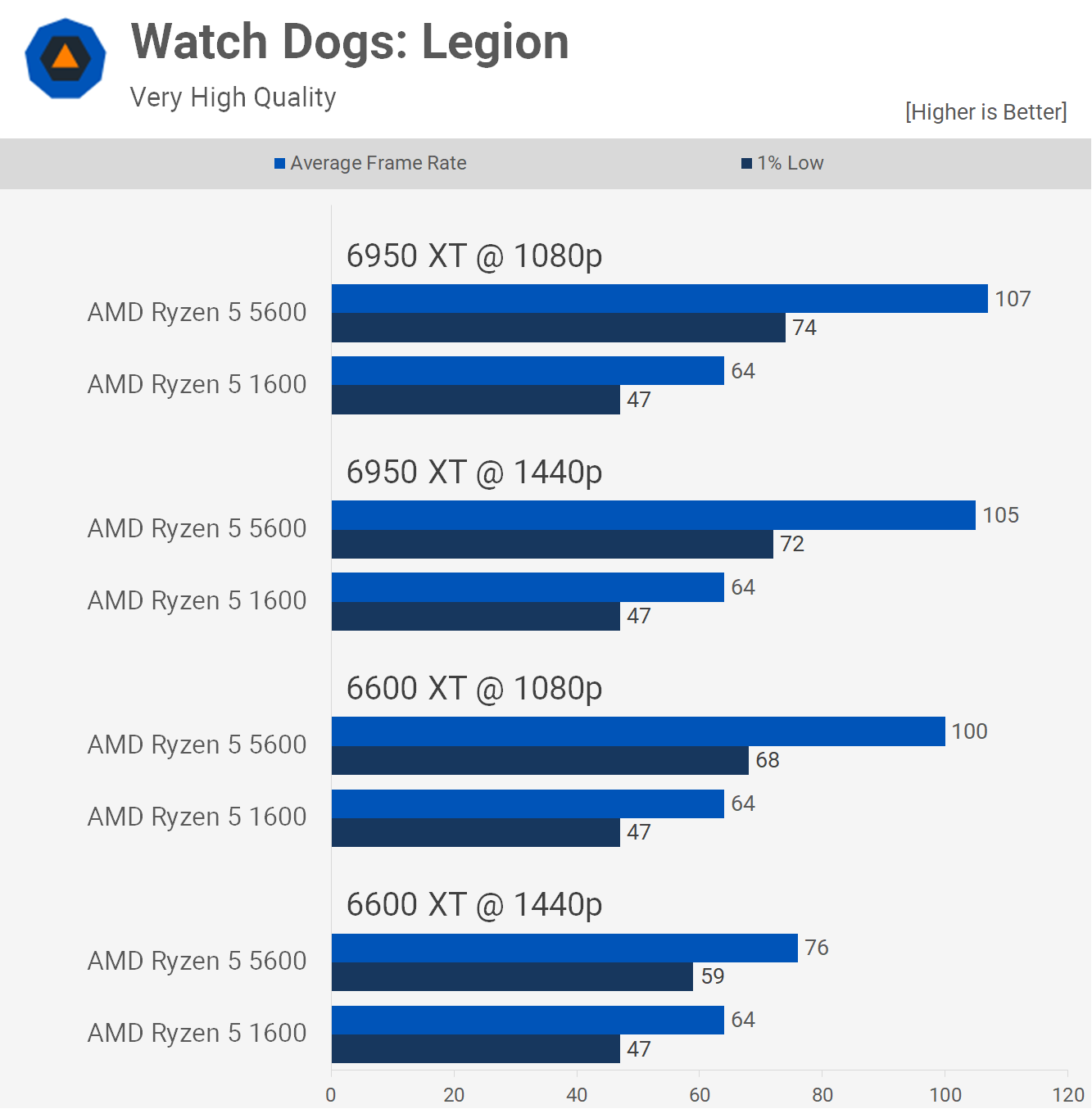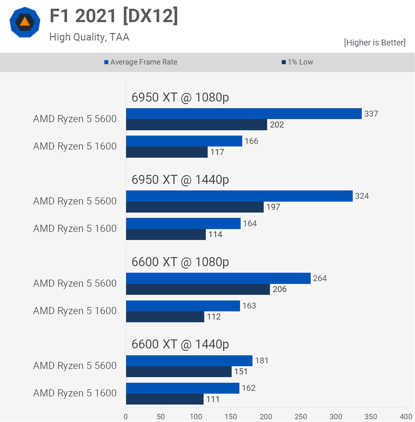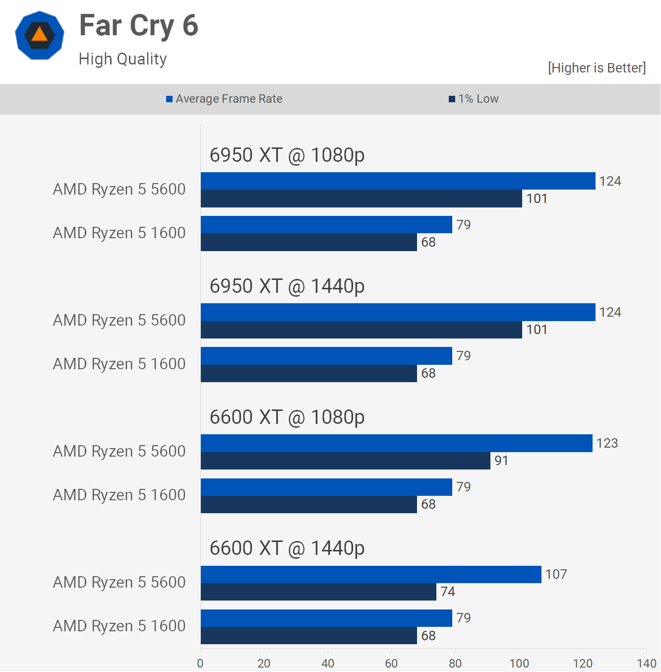 Există o anumită separare cu 6950 XT, deși la 1440p, 5600 a fost cu doar 14% mai rapid și abia până când am scăzut rezoluția la 1080p, marja s-a deschis destul de semnificativ la un avantaj de 32% în favoarea noului Zen 3. procesor. Ryzen 5 1600 a fost foarte jucabil, așa că upgrade-ul procesorului nu a văzut o schimbare mare în acest titlu.