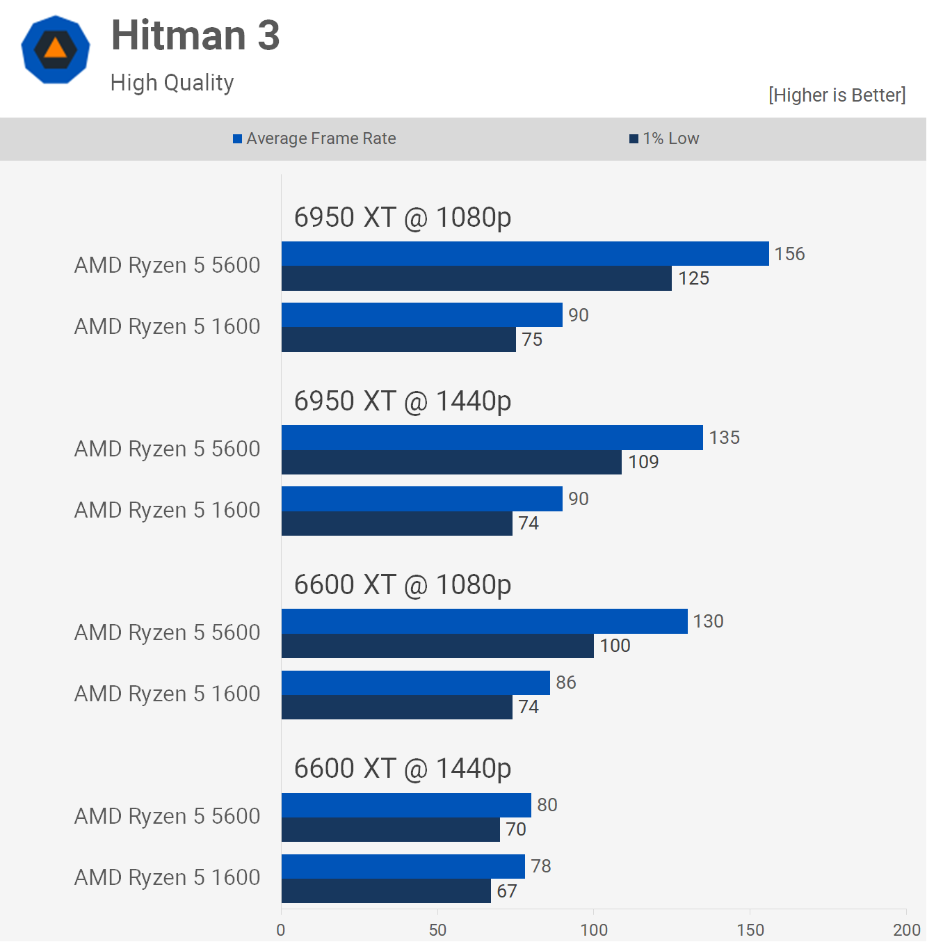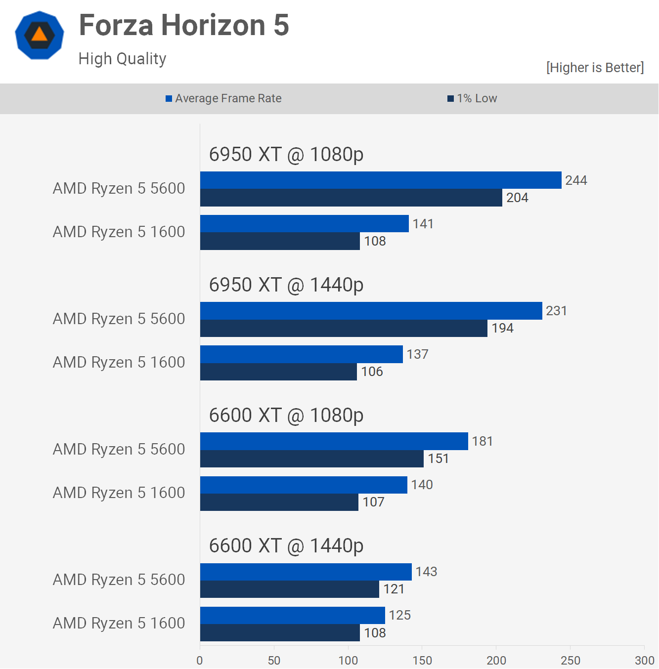 Forza Horizon 5 este un alt joc care nu se sprijină atât de mult pe procesor, deși pentru a împinge rate de cadre foarte mari, veți avea nevoie de un procesor cu un randament mai mare. 1600 este limitat la aproximativ 140 fps, în timp ce 5600 poate ajunge la peste 200 fps, ceea ce îl face cu 73% mai rapid atunci când este asociat cu 6950 XT.
