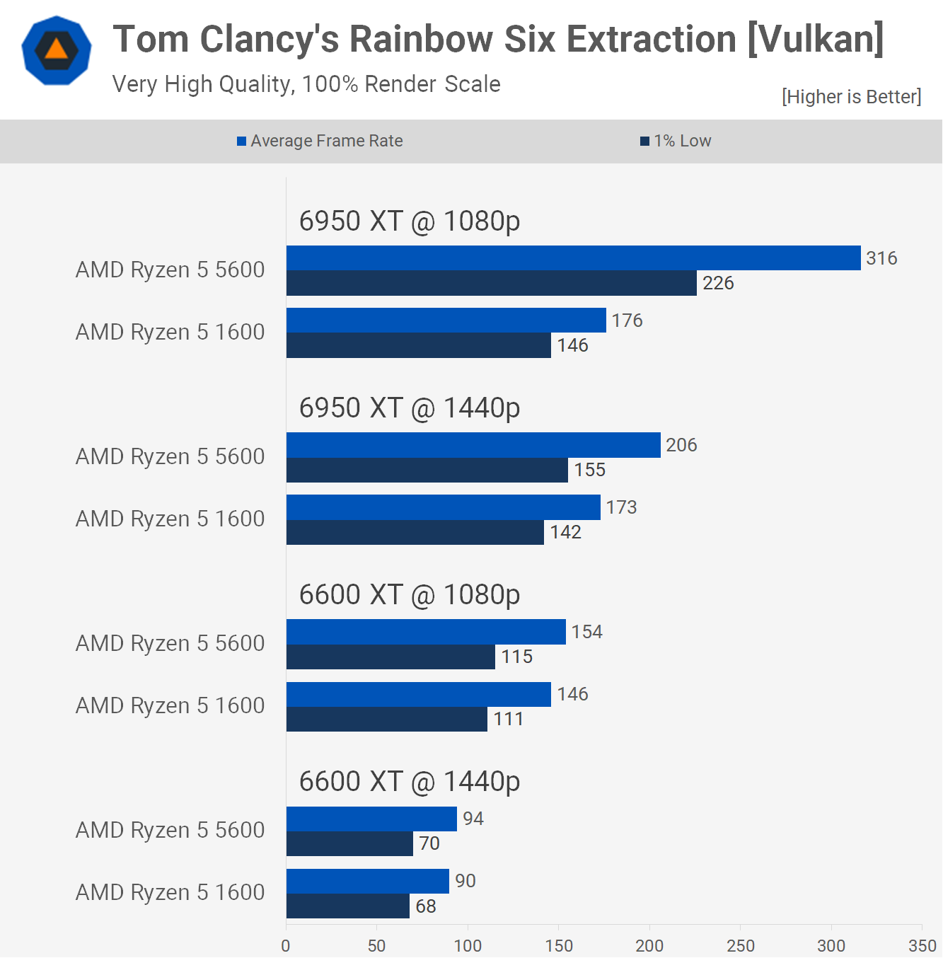 În continuare, avem Rainbow Six Extraction, un alt titlu în care Ryzen 5 1600 este capabil să ofere performanțe perfect jucabile, maximizând Radeon RX 6600 XT cu a doua cea mai înaltă calitate presetată la peste 140 fps în medie și împingând 6950 XT la maximum. 170 fps.