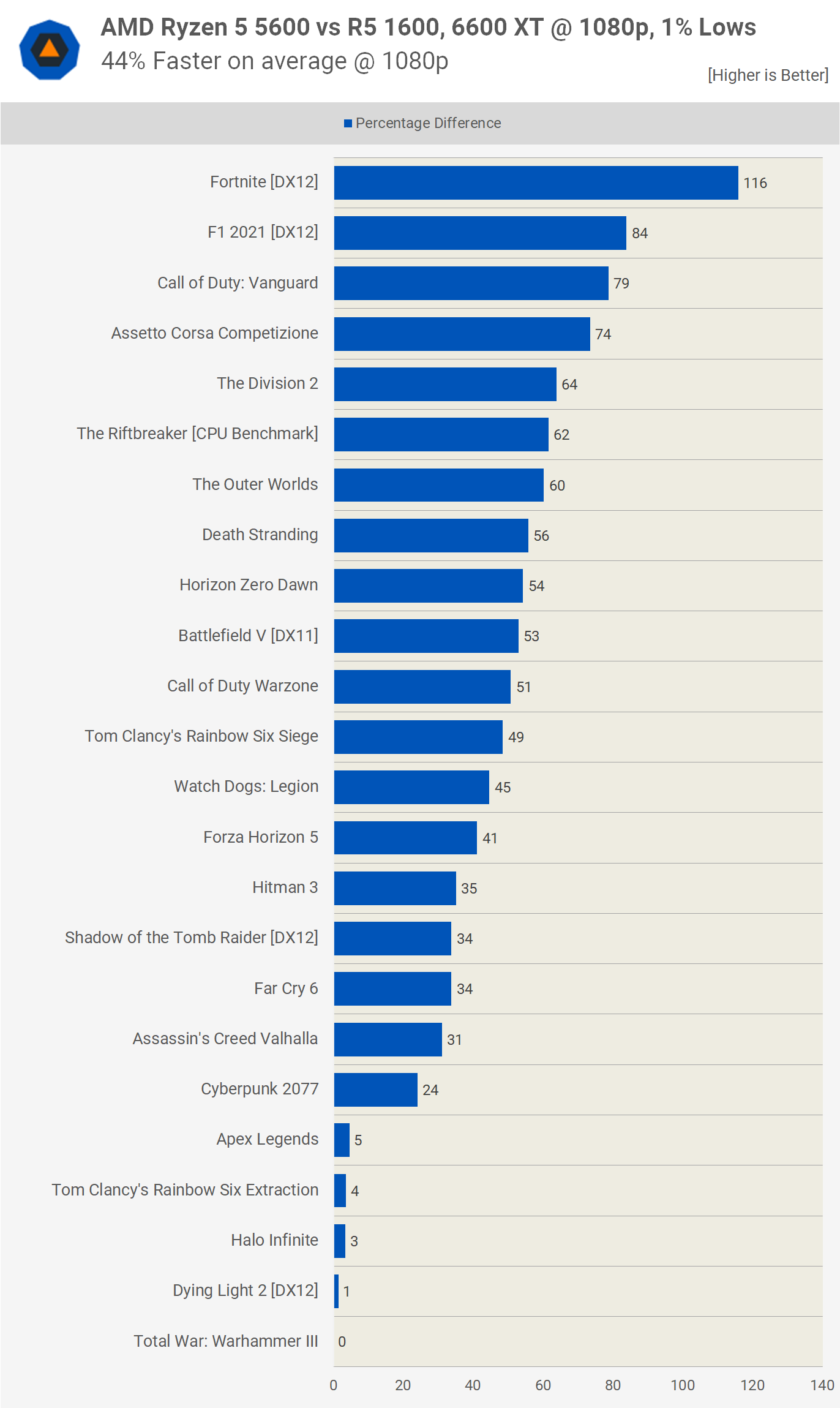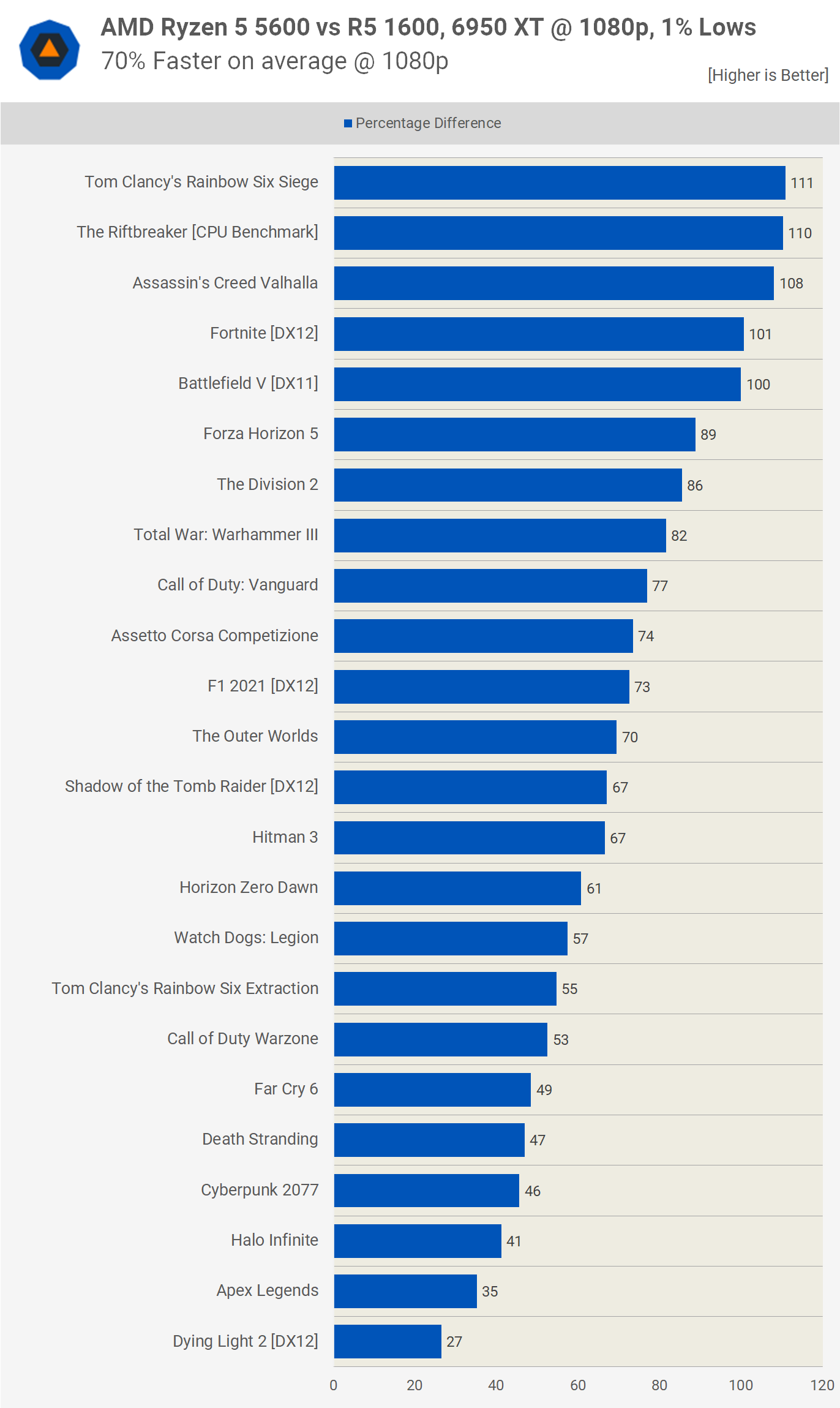 Acum, iată o defalcare a marjelor observate pentru fiecare dintre cele 25 de jocuri testate, luând în considerare datele scăzute 1080p 1% atunci când sunt asociate cu Radeon RX 6950 XT. În medie, am observat o creștere a performanței cu 70% pentru Ryzen 5 5600, cu creșteri de până la 111%. Cu toate acestea, cele mai mici câștiguri au fost în jur de 30%, așa că pentru GPU-urile de vârf, aceasta este o actualizare serioasă a procesorului.
