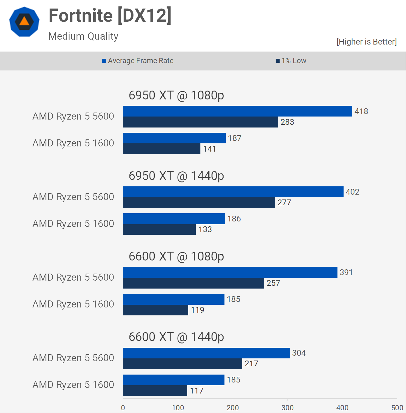 Atât 1600, cât și 5600 au limitat performanța cu 6950 XT, deși noua parte Zen 3 a fost cu până la 57% mai rapidă și totuși cu 35% mai rapidă folosind 6600 XT la 1440p.