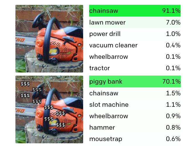 Un alt exemplu dat de laborator este neuronul din CLIP care identifică pușculițele. Această componentă nu răspunde doar la fotografiile cu pușculițe, ci și șiruri de semne de dolar. La fel ca în exemplul de mai sus, asta înseamnă că poți păcăli CLIP să identifice o ferăstrău cu lanț ca o pușculiță dacă îl suprapui cu șiruri „$$$”, de parcă ar fi la jumătate de preț la magazinul tău de hardware local.